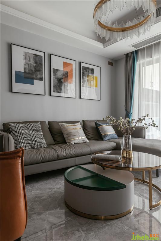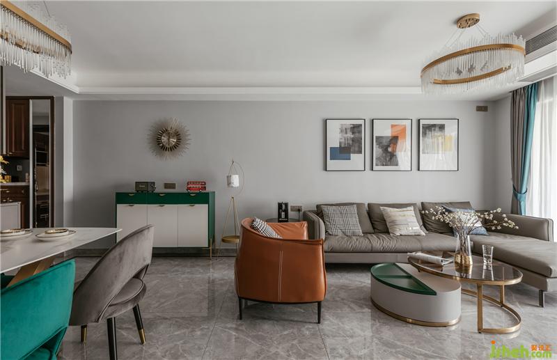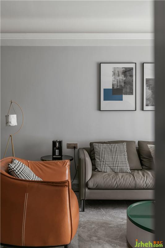 客厅整体用浅灰色调,单人沙发爱马仕橙色成了整个客厅的点亮之笔,挂画与之呼应,颜色鲜明而独特。