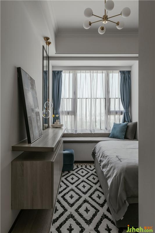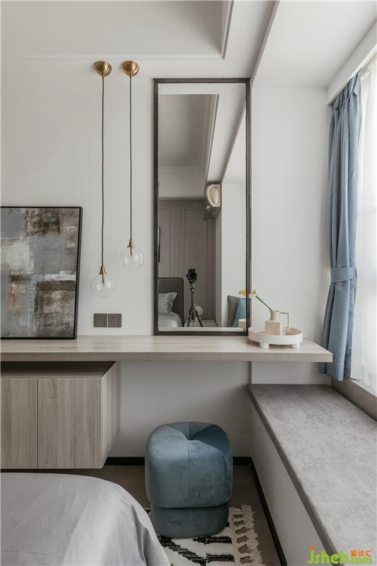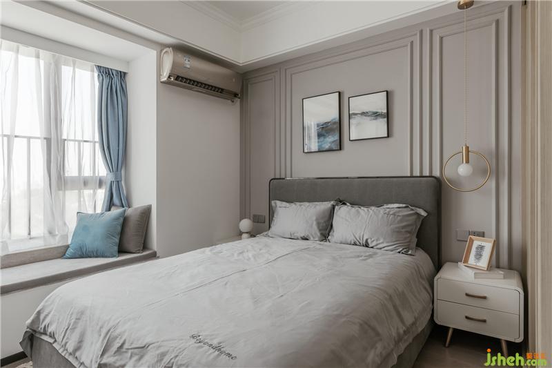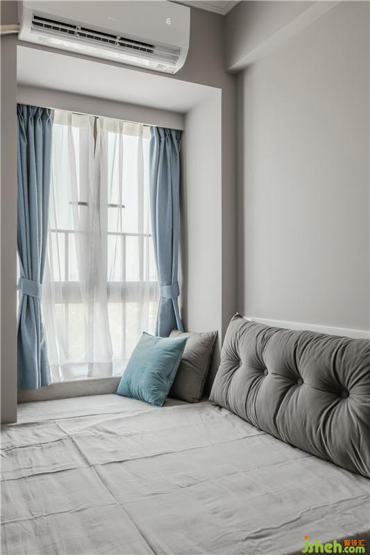 灰色的床品,奶灰色的背景让整个装修设计风格得以延伸,设计师在软配上用灰蓝色做点缀,为卧室营造宁静的氛围。