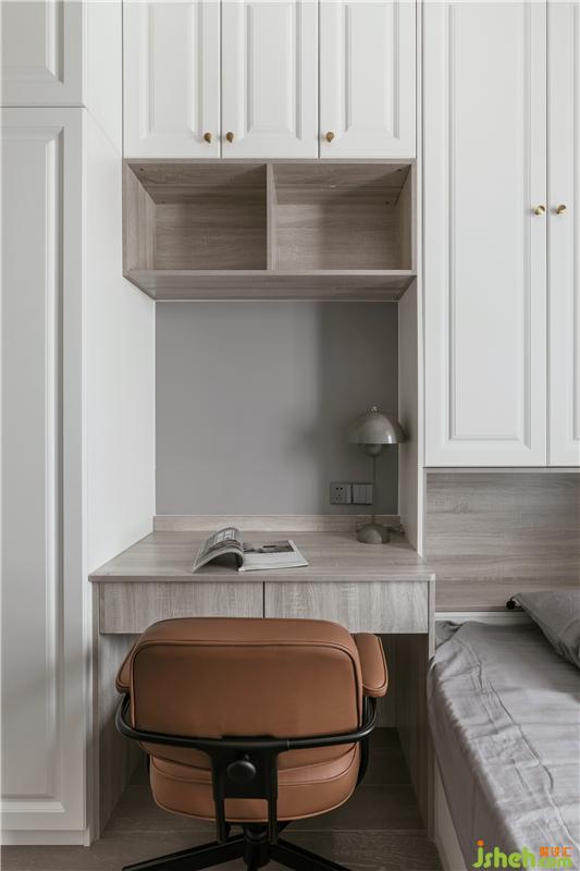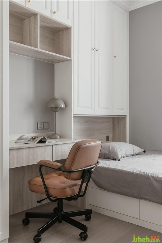 未来的小孩房,收纳式榻榻米,让活动空间最大化还解决大量的收纳空间。米白色的柜门与奶灰色墙面形成鲜明对比,再配上灰橡木的开放层板,使空间简洁明亮又不单调。