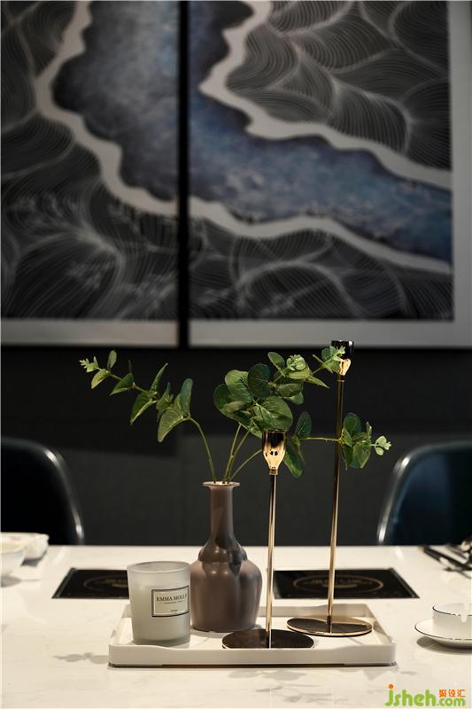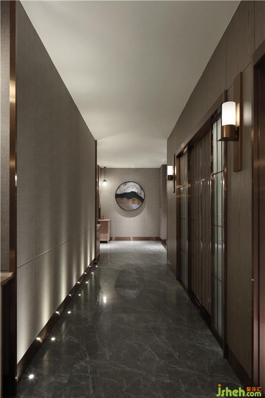 穿过走廊,金属质感的墙面使空间显得更为开阔,明朗。礼宾落座,环顾四周,深浅相间的棕黄木色让人静心静气。偶有一点盆栽的翠绿,好像少女嘴角的美人痣。