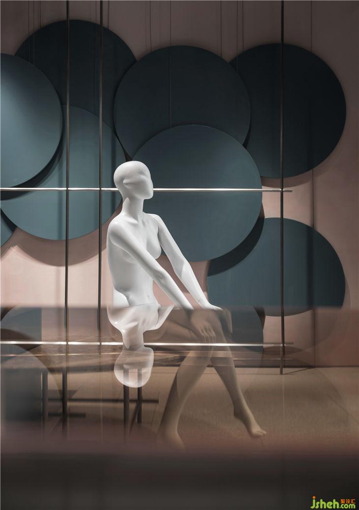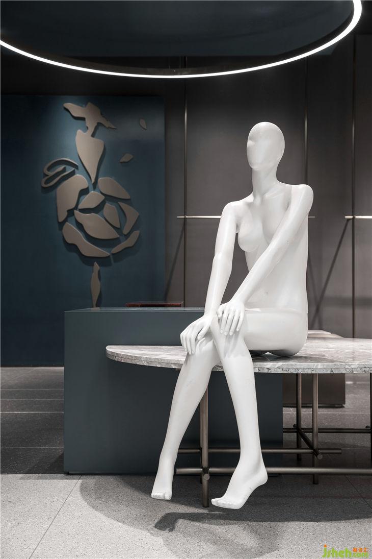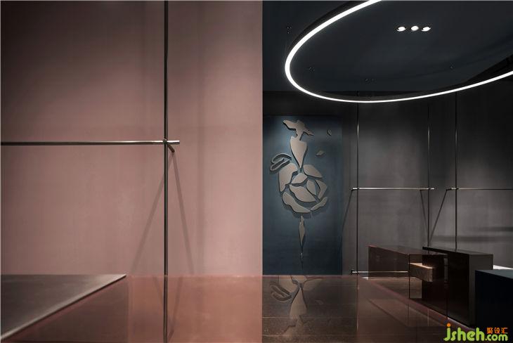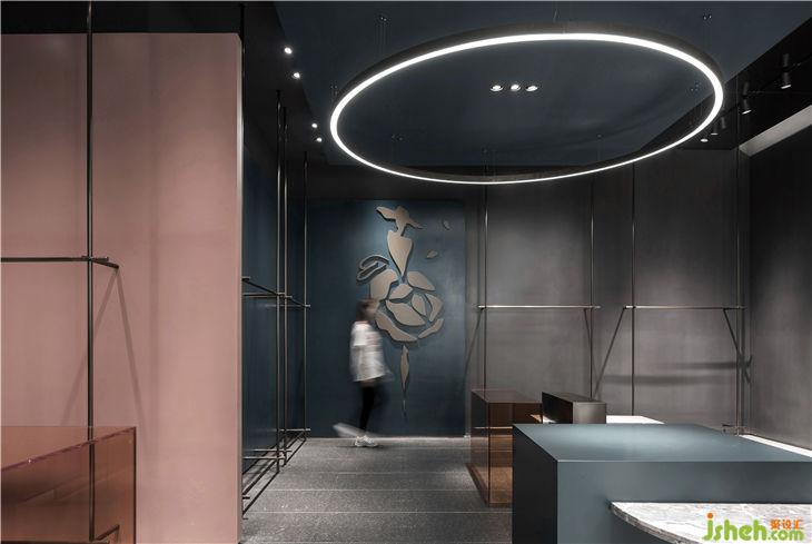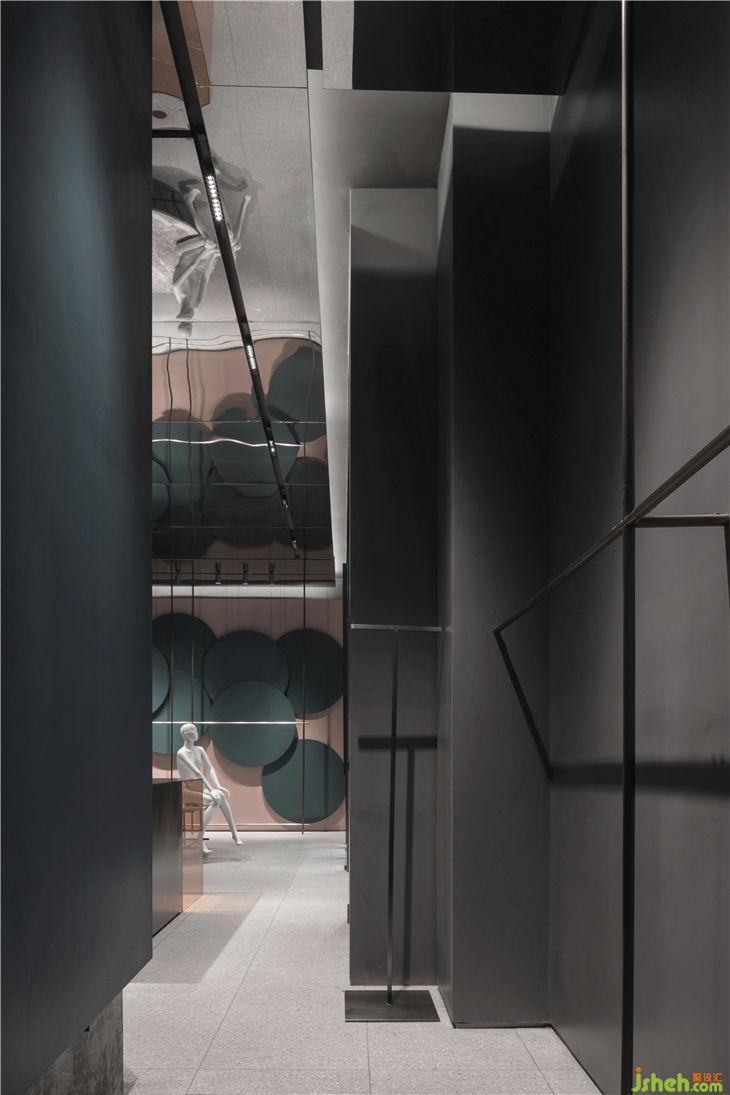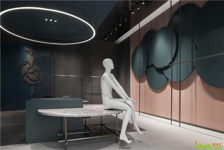 为了在空间里达到视觉上新的认知惊喜与商业趣味性,在天花局部使用镜面金属,在横向与竖向的空间达到延伸与折变,获得新的视觉体验;