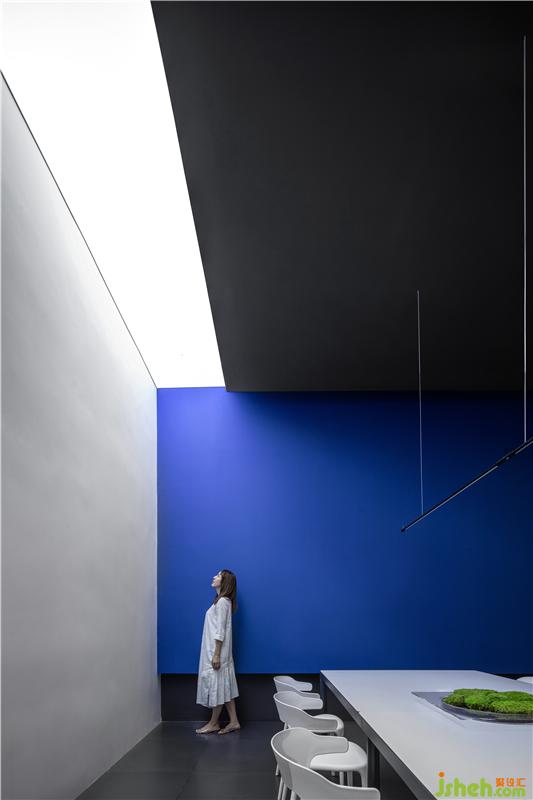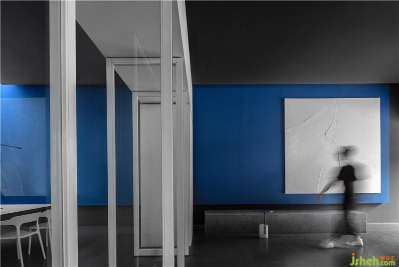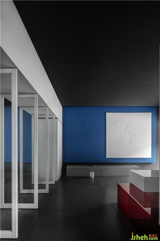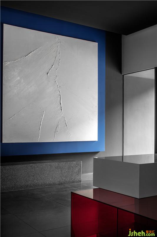 蓝色交汇着红色光影, 一切在缓缓的时间流动中充满了凝聚的力量,印证着在同一享受的空间里原本就没有真正异己之物的存在。所有可透视的表象明见性,使存在本身变得不由分说,空间也由此相互独立、融合,从而创造有趣生动。