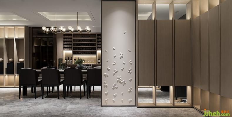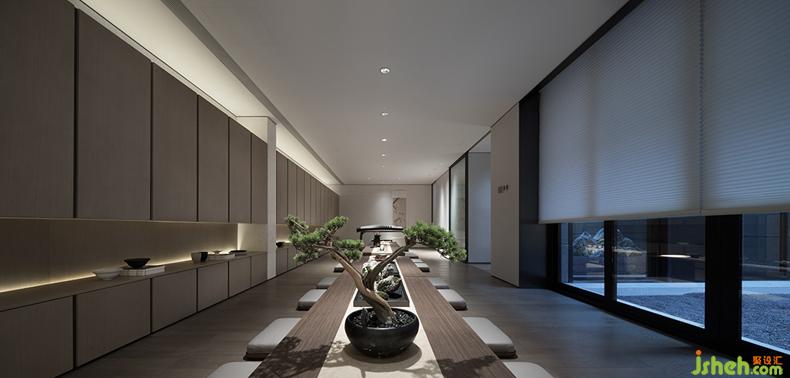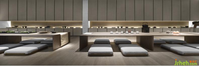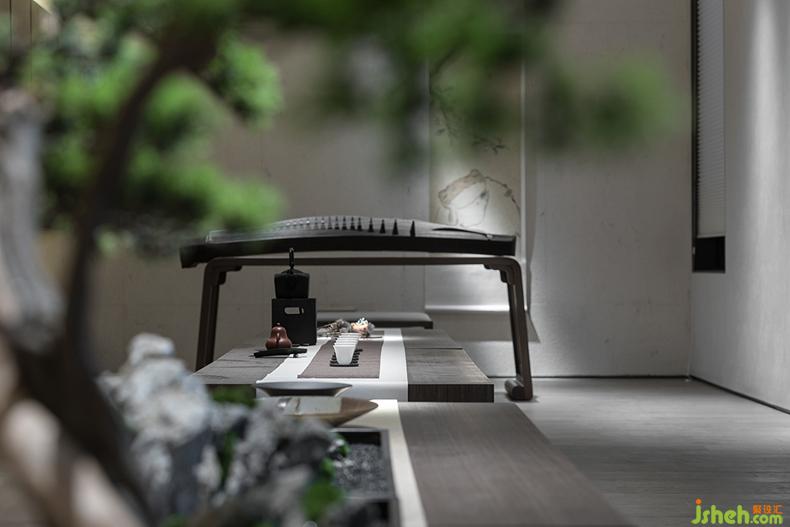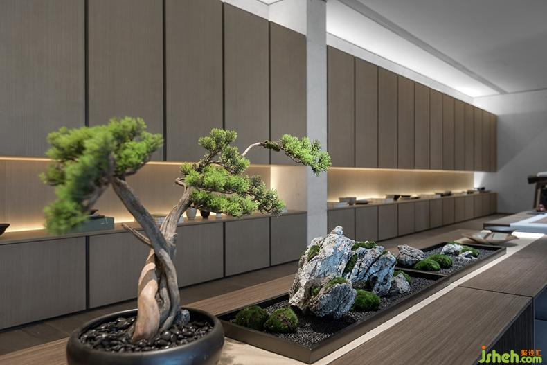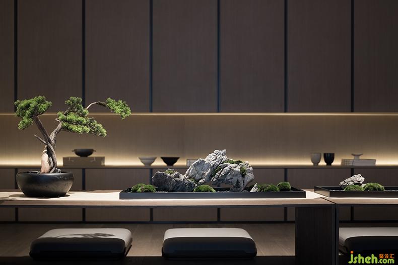 茶室家具木色与硬装木色相近,为中性暖木色,茶桌不高,旨在让人进入空间学会放下自己,盘腿而坐。前座备有琴桌,中座则布有茶席,后座是小景式山石加植物,背面更有日式枯山水相衬,加之侧面墙的展示台处展示的中式书籍及不同质感的陶瓷盛器。仿佛一场盛大的文人雅集活动即将开场。一人抚琴,一人泡茶,众人低首聆听。与茶室正侧方悬挂着德梵的《清凉》绘本欲要表达的一般,“若识本心,即是解脱”。