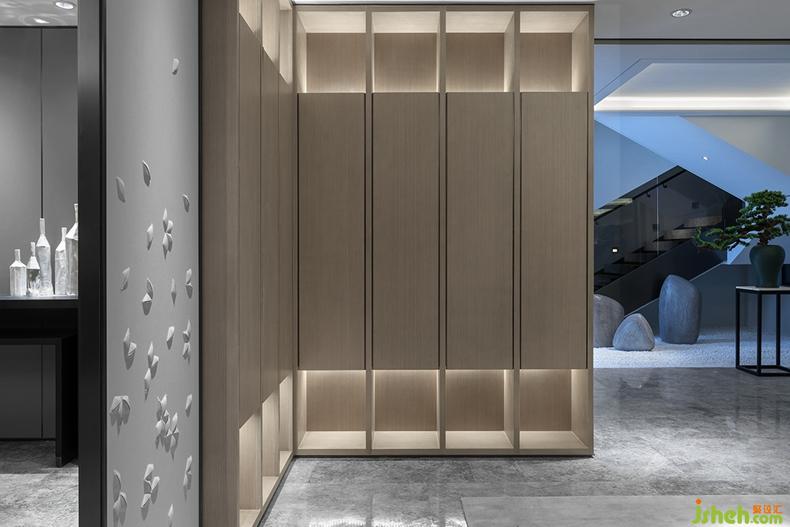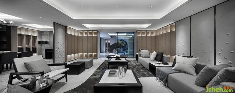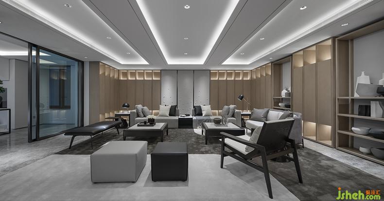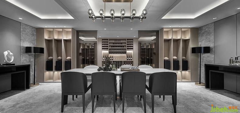 移步到休闲区红酒区,它是另一片天堂。休闲区家具整体布置走的非对称原则,红酒区则是对称原则,家具款式简约大气。笔直的线条加之细节人性化撞角处的弧形处理带来的设计感,同时考虑人体工程学的舒适度。家具的材质上,亲肤细麻布料配上柔软的磨砂皮及半哑细皮,高冷的白色大理石,哑黑的开放漆木纹与枪黑无指纹不锈钢脚。营造出放松、舒适的休闲空间。打开绅士的台灯落地灯,在这微醺的环境下,倒上红酒,细细品尝不一样的人生,正所谓:酒不醉人,人自醉。