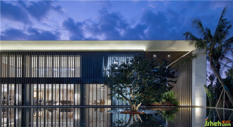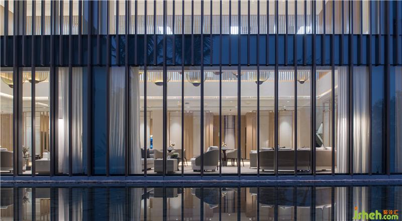 一池半海售楼处是标准的L型单体两层建筑,整体挑高的玻璃幕墙,即便是在室内,也能把中庭的水景一览无余。装修公司