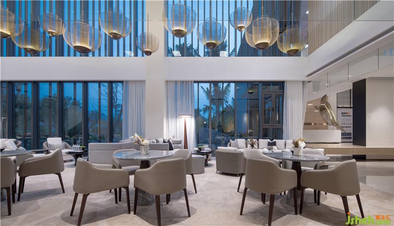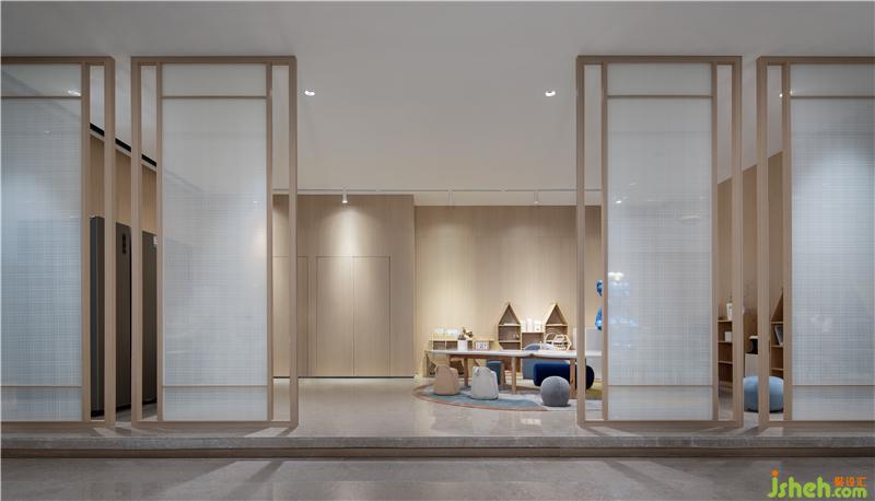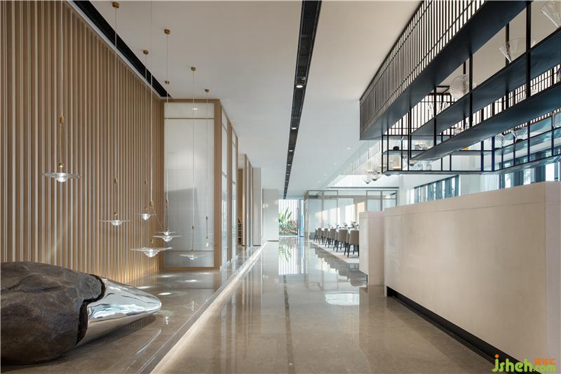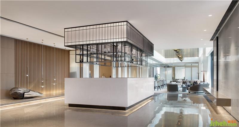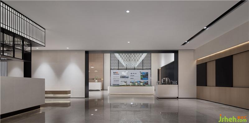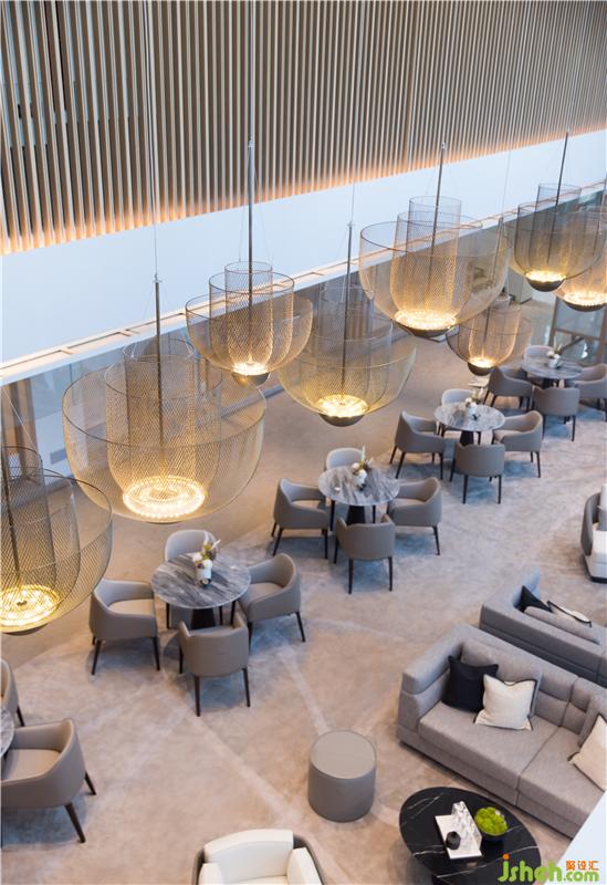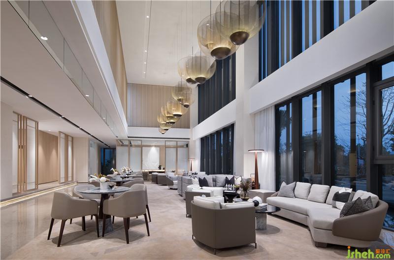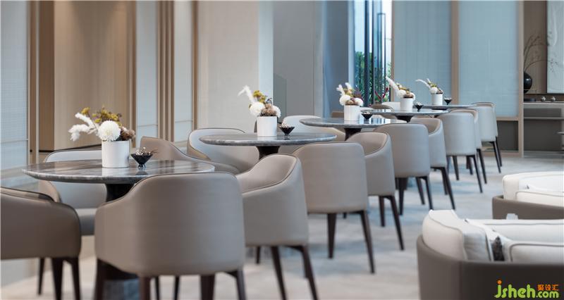 洽谈区倚靠窗边,窗外一片水景。室内大面积以天然木色为基调,暖灰色系皮革与棉麻布艺结合的家具,营造舒适的洽谈区。装修公司
