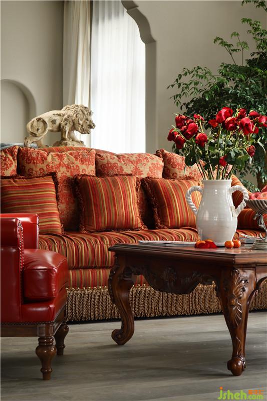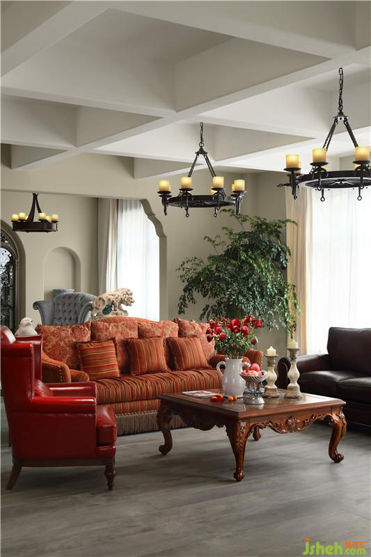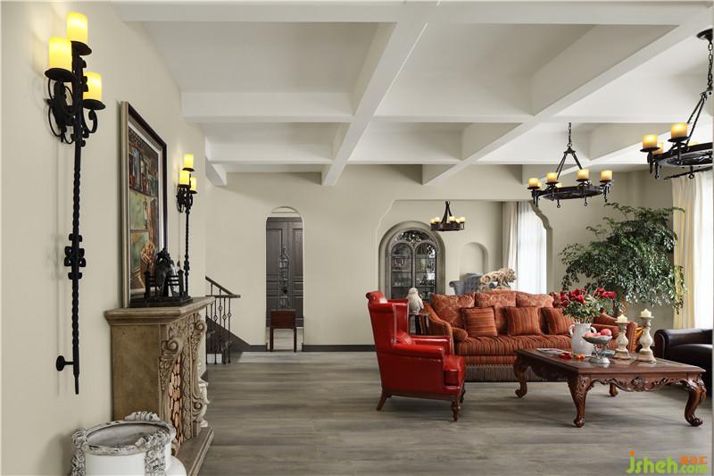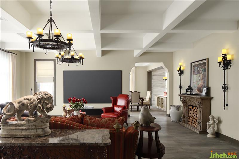 整栋别墅墙面只用了一种材料——硅藻泥,除了环保性,设计师更加看重的是其接近土地的质朴肌理,还原生活的纯粹性,以及可以成为空间与人沟通的媒介。九宫格的梁顶设计巧妙将原本横在客厅中间的大梁化缺点为优点,并且突出了空间的建筑感。因为我们知道,对建筑生命的尊重是设计的本源。红色条纹布艺大沙发是从工厂仓库找到的绝版,虽然售价不菲,但其价值远超其价格。富有层次的色彩与褶皱,极好的包裹性,端庄的结构设计都是我们对其爱不释手的原因。别墅装修设计