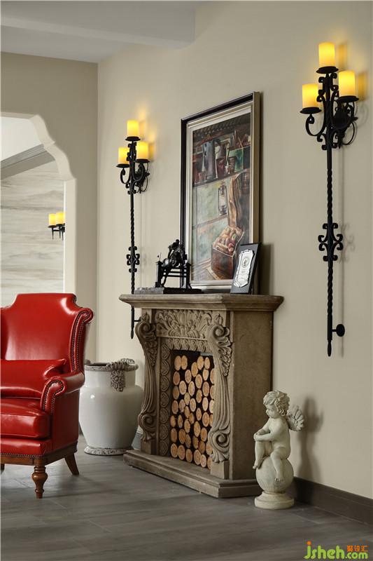 进入软装搭配阶段后,业主委托我寻找一款合适的壁炉放在客厅。寻遍市场仍无中意款式,直到那个雨天在庭院的角落看到了落满灰尘的一个砂岩壁炉,眼睛立刻放光。将其清洗干净安放到这里,再次化腐朽为神奇。油画虽不是大师作品,但细腻的笔触,流淌的色彩仍然堪称经典。浅灰木纹仿古地砖按照设计的要求切割拼贴,古朴的韵味透出了高级时尚感。