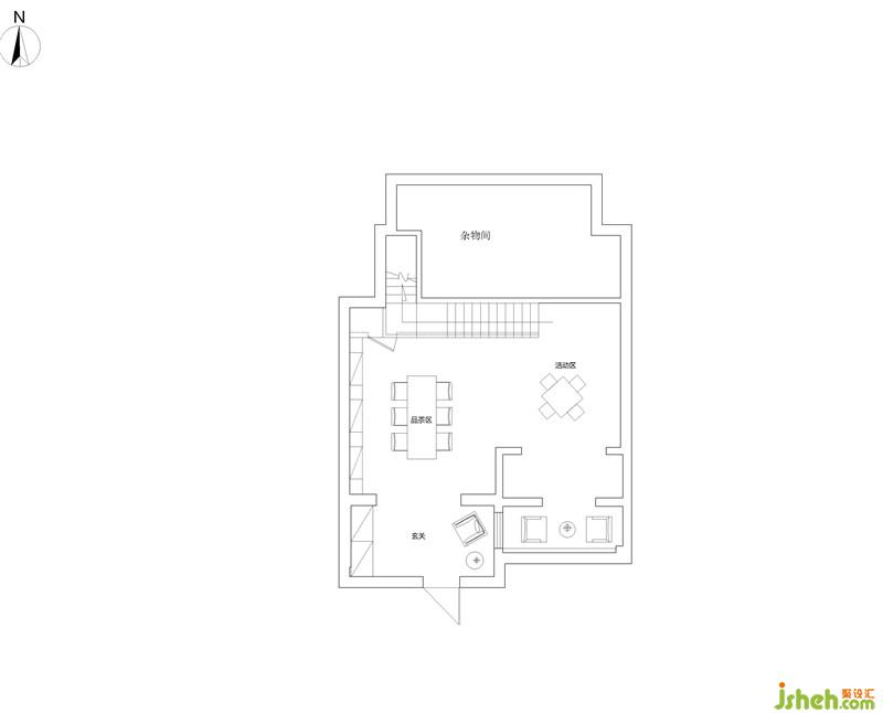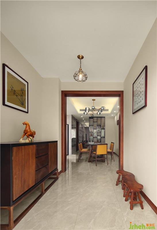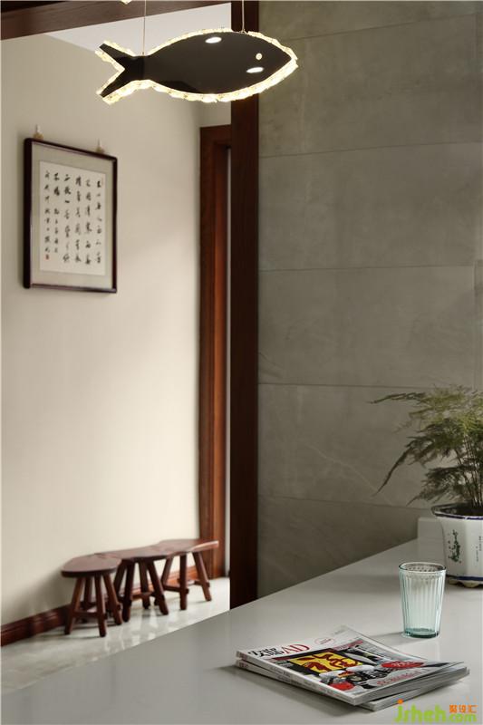 l 玄关 l 自然流线形的换鞋凳是商家的赠品,由三片小凳利用榫卯结构拼接而成,细微之处独具匠心。写意国画与对面书法并没有让空间陷入沉闷,反而因其与创意灯具的配合表演,让我们欣赏到了一种建筑的节奏美。