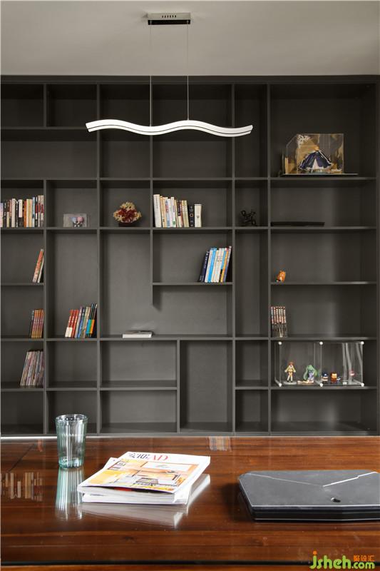 l 书房 l 烟灰色书架也是定制款,厂家非常配合。我们想在空间中创造出一些惊喜,与波浪形状的LED吊灯玩一个游戏,而桌上的外星人电脑则伺机而动。