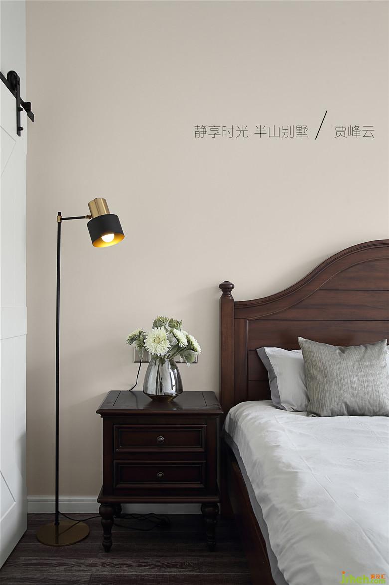 卧室格调优雅米灰床具配以红色麻布窗帘为安静的休息空间增添些许私密感