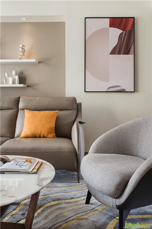 我们希望家的氛围是柔和安宁的,于是用了浅灰墙板做了沙发背景,利用承重柱与墙体的厚度差做出了陈列区,艺术品在这个空间里完全服务于生活,灰紫的画呼应了隔板上的美丽盆栽。室内设计师不同于艺术家只专注于创作,还应该做好项目的执行管理。艺术品应该是生活的元素。