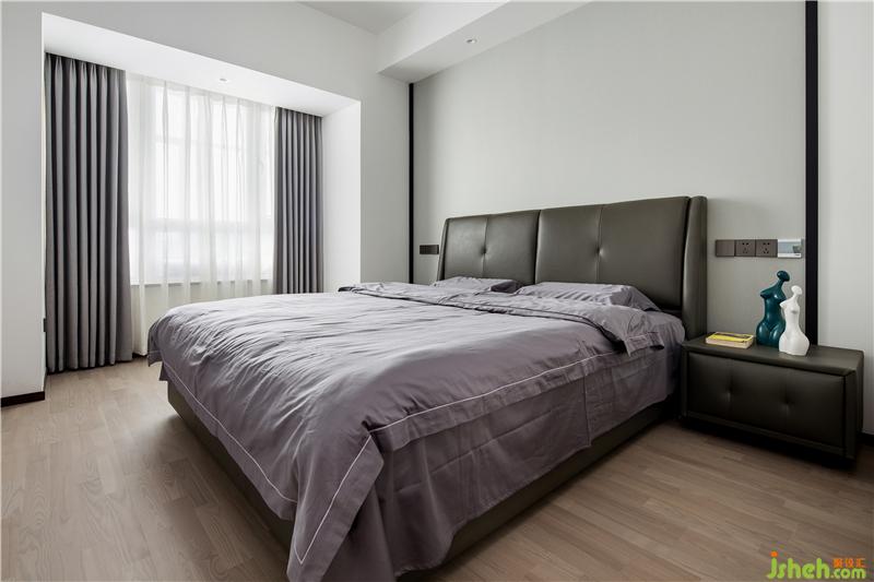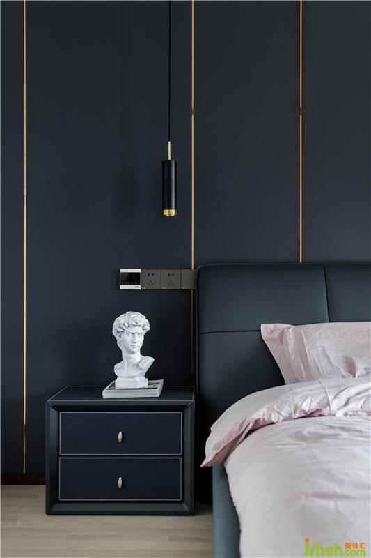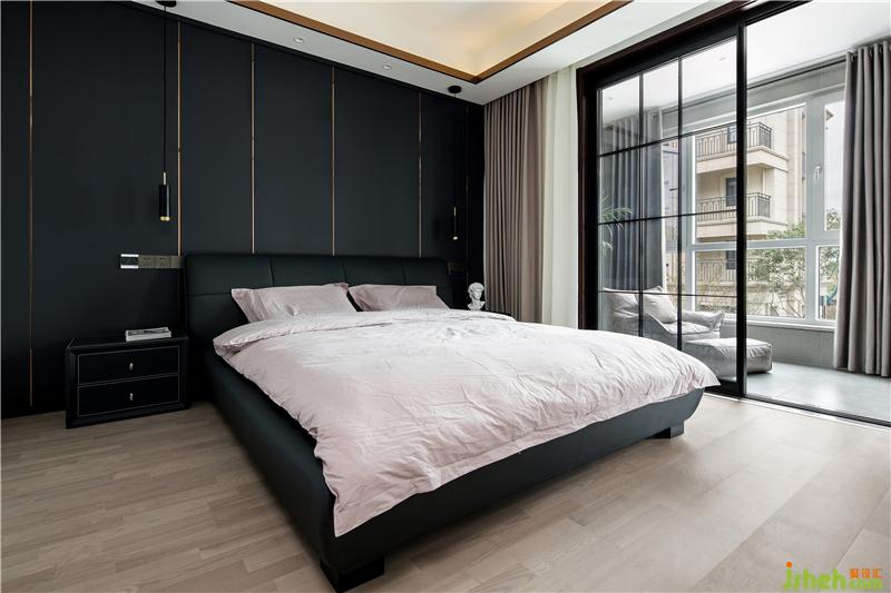 主卧定了深色的基调,原本硬包的背景后来改为板材,干练许多。这样大胆的空间搭配得益于甲乙双方高级别的信任,落地后的效果可以消灭一切怀疑。地板用了金钢铂林的进口系列,质感确实不错。
