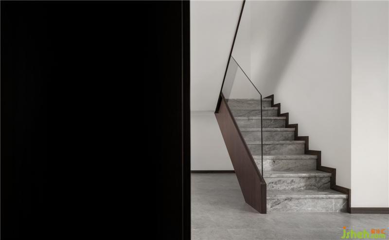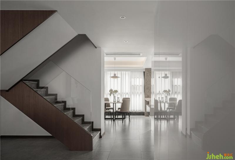 反过来从客厅向餐厅透视亦然,楼梯的雕塑感是让设计师最为得意之笔,虽然几经周折,但最终落地仍然趋于完美。