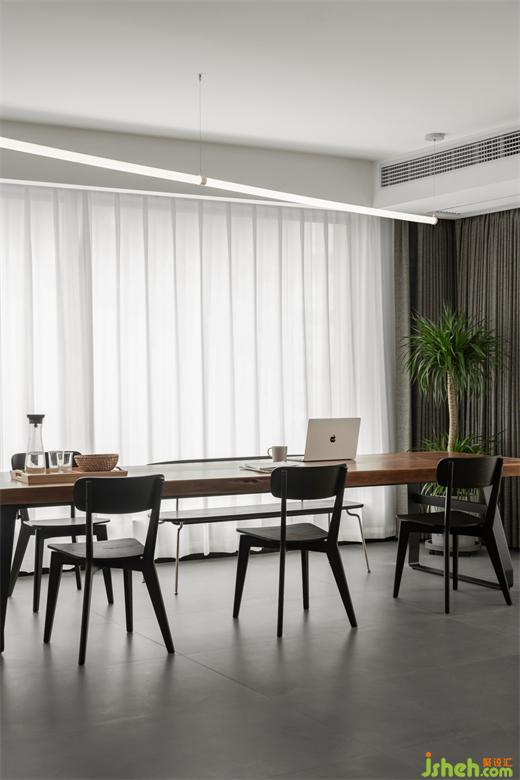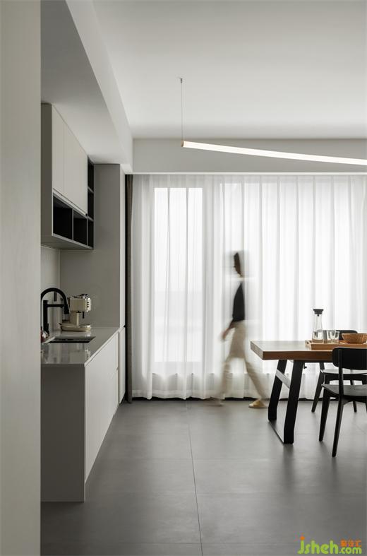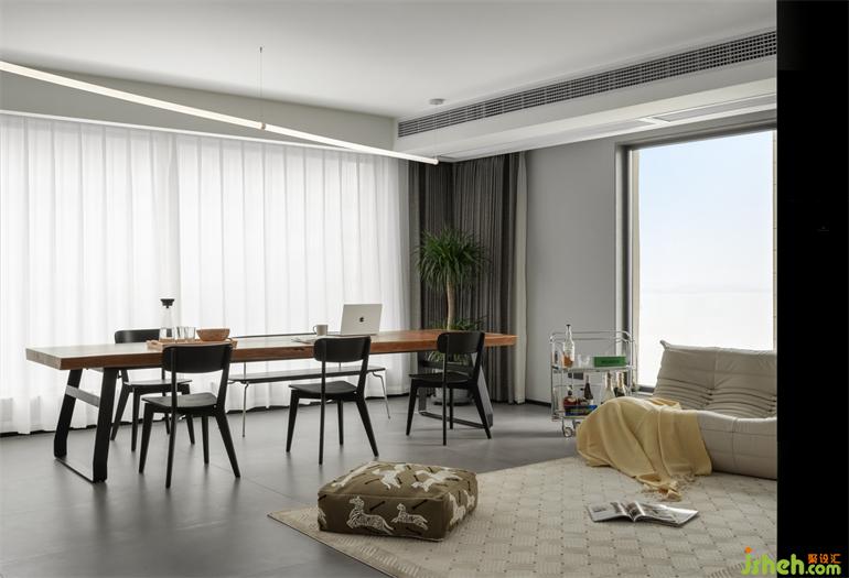 The large floor glass with extremely narrow frame integrates the river scenery into the "picture frame", and the indoor and outdoor interaction makes the home aesthetics present a natural art. A light column is hung on the top of the large horizontal hall, extending from the kitchen door to the end of the long table. The cement grey floor tiles display the background color of minimalist and exquisite life. The projector standing behind the "Caterpillar" sofa replaces the TV to add a happy plot to life.