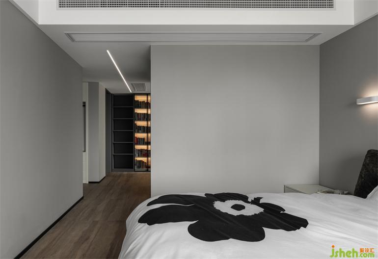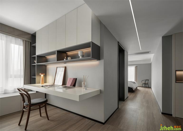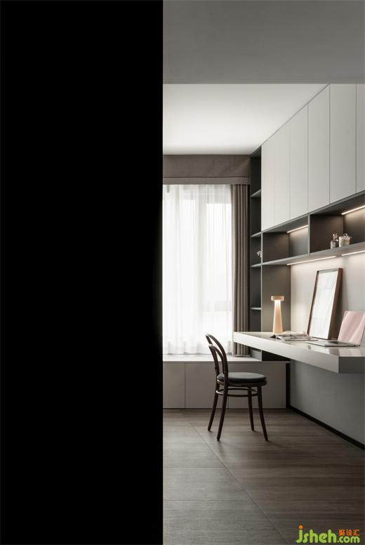 阅读区设计在主卧套房的北端,悬浮书桌与飘窗错落安放。妻子温柔盘腿窗边手捧文学书,拉开窗帘就可欣赏窗外美景,先生打开电脑正襟危坐规划事业蓝图。艺术住宅设计这便是简单生活的美好画面。