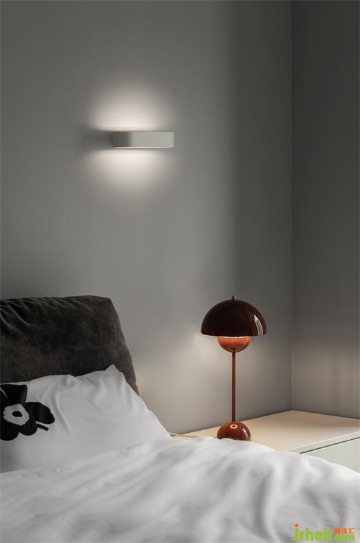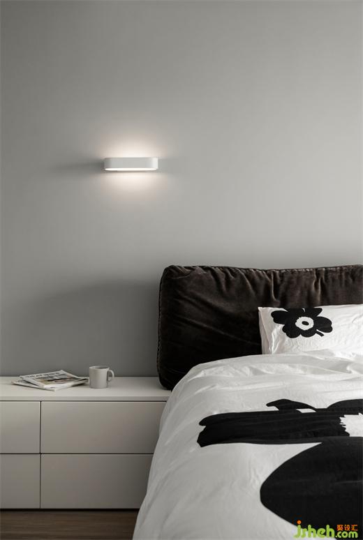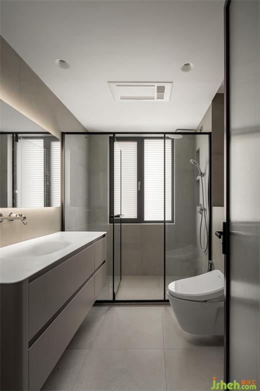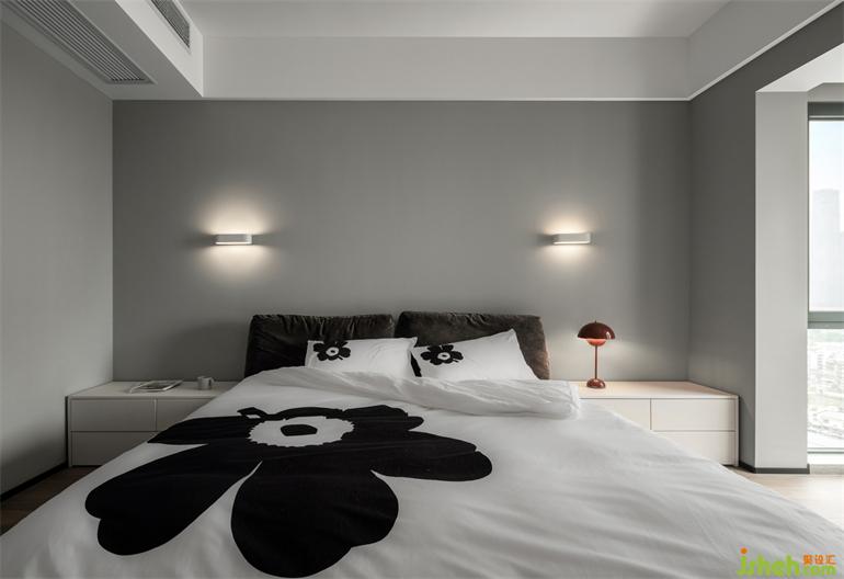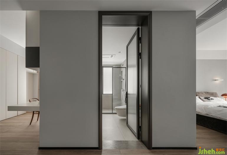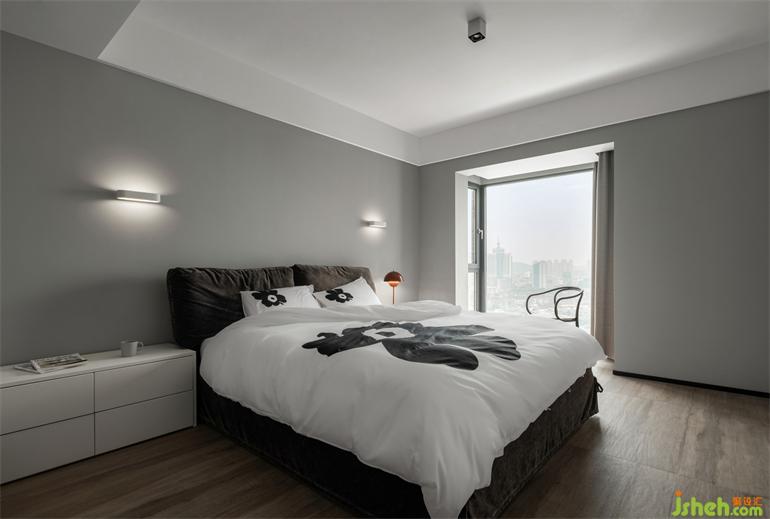 艺术住宅设计卧室和卫生间采用米灰主题,透过落地玻璃窗可以放眼城市的容貌,红色台灯点缀了幸福,安静之中透出生活的小惊喜。