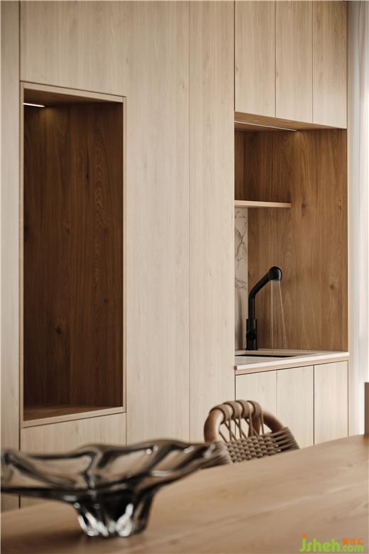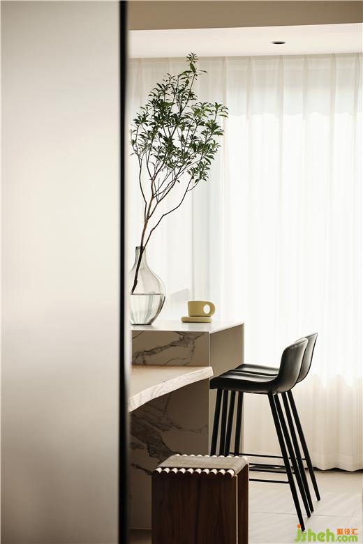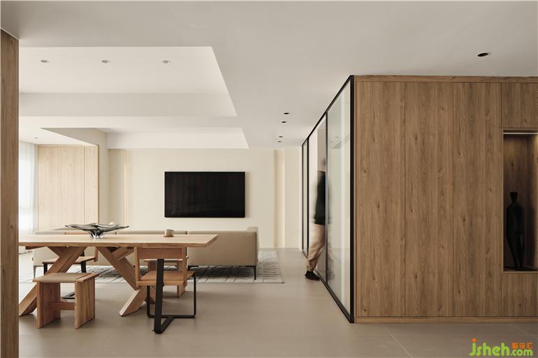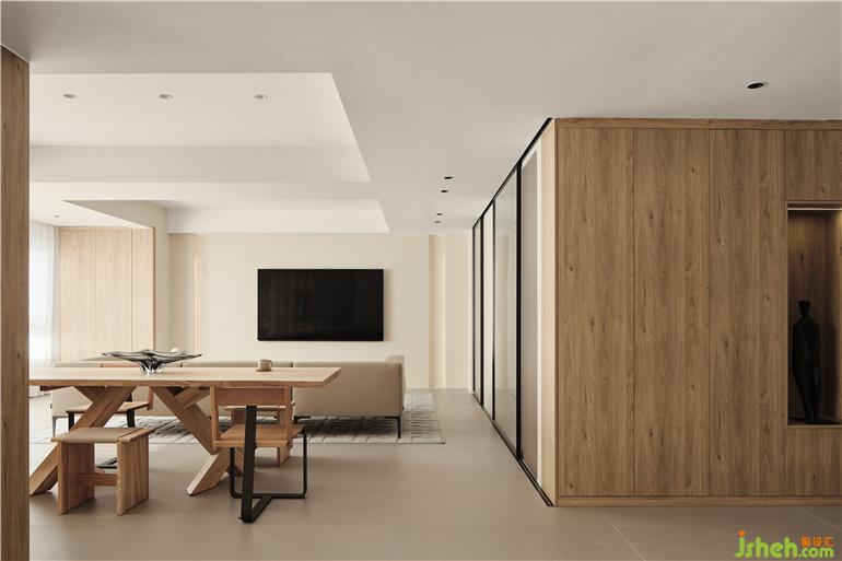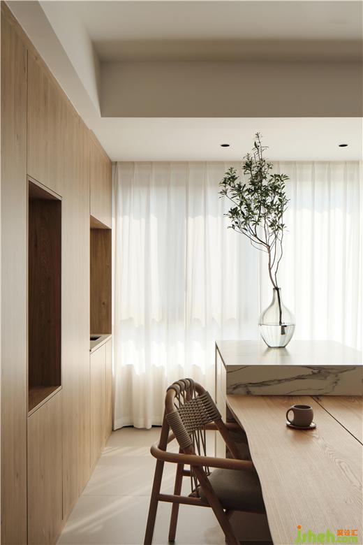 一层大横厅的构图,镇江豪宅设计将起居室与餐厅、书房平铺展开,空间之间的互动变得直接明确。原木色调的家具配合奶咖的墙壁,展现出生活的温柔表情。餐厅与水吧空间合二为一。立柜隔断了餐厅与书房,白色钢板的雕塑静立壁龛之中,让就餐环境融入当代艺术的调性。
