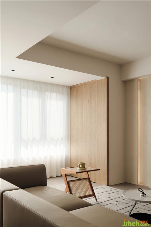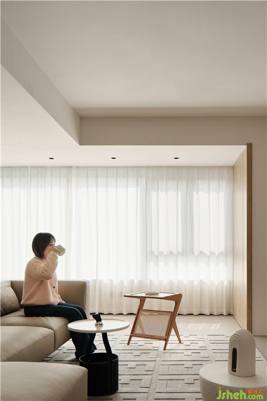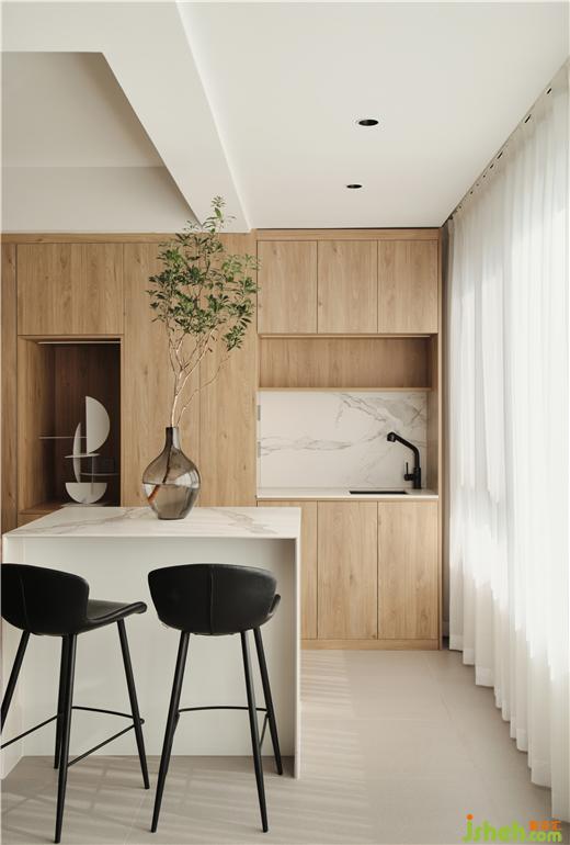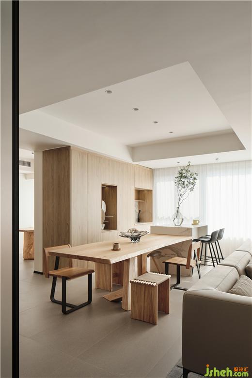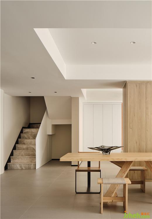 The composition of the large horizontal hall on the first floor spreads the living room, dining room and study flat, and the interaction between spaces becomes direct and clear. The furniture in log color matches the wall of milk coffee, showing the gentle expression of life. The dining room and the water bar are integrated. The vertical cabinet separates the dining room from the study. The white steel plate sculpture stands in the niche, making the dining environment blend into the tone of contemporary art.