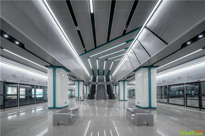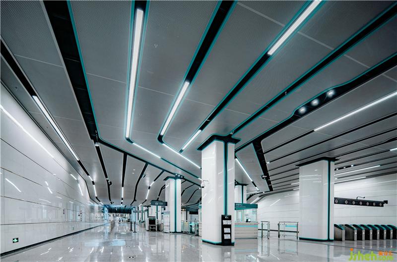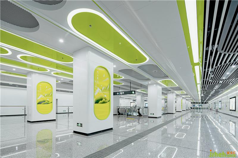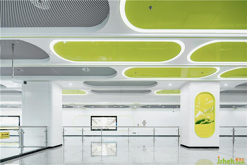 J&A 融合对天花、墙面、柱面、地面空间的整体构思,营造出流畅、舒适的建筑装饰艺术氛围。蓝绿两色代表蔚蓝天空与青草大地,孕育世间万物,将自然与城市轨道交通相融合,体现蓉城人民的包容与豁达。