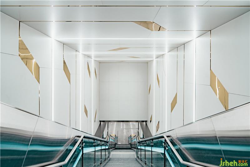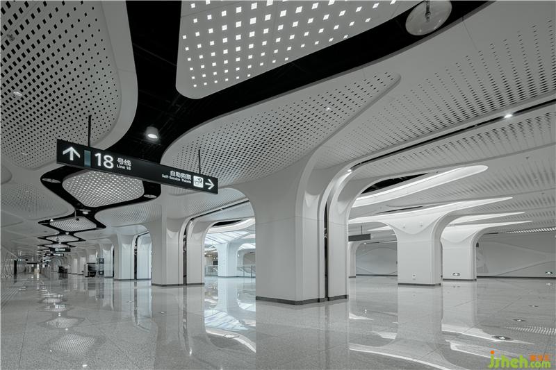 锦城广场东站临近世界最大的单体建筑——新世纪环球中心。设计灵感来源于环球中心主体建筑,通过提取其优美曲线,组合成具象规则的图案,J&A以“城市天堂”为设计主题,组合空间轮廓,打造出一个完整立体的空间,突显出空间的整体性。