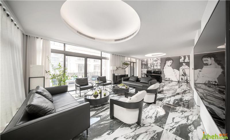 客厅及主要房间地面都采用水墨画瓷砖,用简洁现代的手法表现中国山水元素,典雅却不古板。客厅大幅海报照片墙记录成长的点滴记忆,别墅装饰造型简约的黑色桌椅,颇具张力的雕塑和黑色钢琴,带来强烈的艺术气息。餐厅氛围清新怡人,恰好为家人带来愉悦的用餐心情。阳光正好的时候在院落里对坐发呆,也不失为一个奢侈的享受。