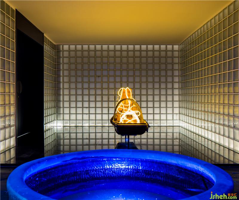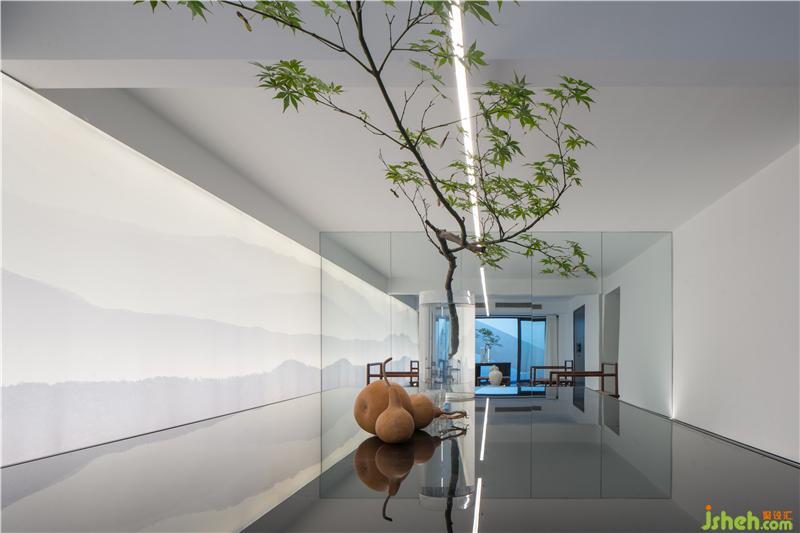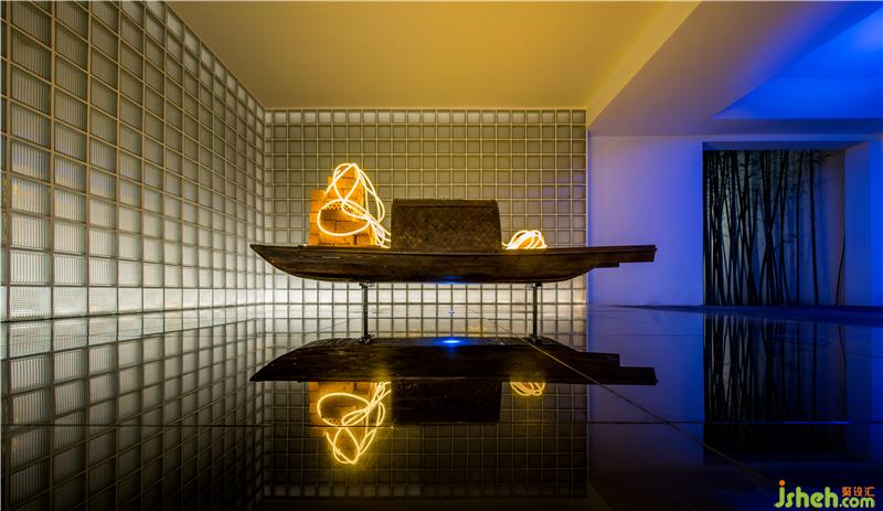 茶室入口处一艘小船承载着夕阳的余晖,不知是停靠还是驶向远方。一泊古船、一汪水景与一丛草木,茶室中古朴禅意与现代材质玻璃砖墙面的碰撞,逸趣横生。快意人生,不仅有美酒,更要有好茶。对于钟爱江南文化的设计师来说,山水画和品茗意境最是相得益彰,有此背景的山水灯膜为品茗多添了几分意境别墅装饰。