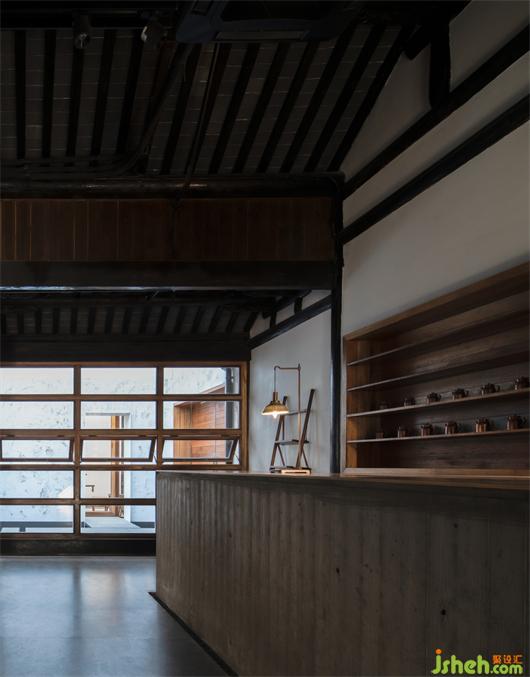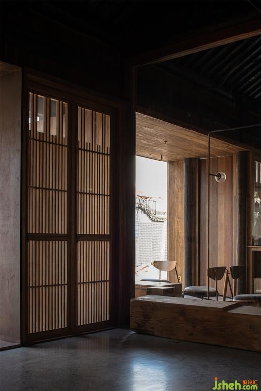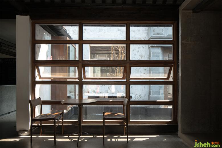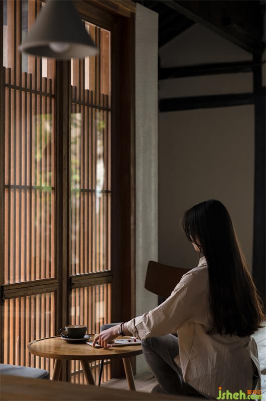 At the newly furnished entrance, the window of flower-shaped lattice is replaced by that ofslimwoodgrilles, generating a lighter and warmer feeling. A convex French casement window made of wood and glass is also employed to make the space brighter and roomier. Leading to the cafe is an aisle sitting on the side; with its stone road curving through sand and pellets, it creates an atmosphere of gentleness that is typical in the south of the Yangtze River.