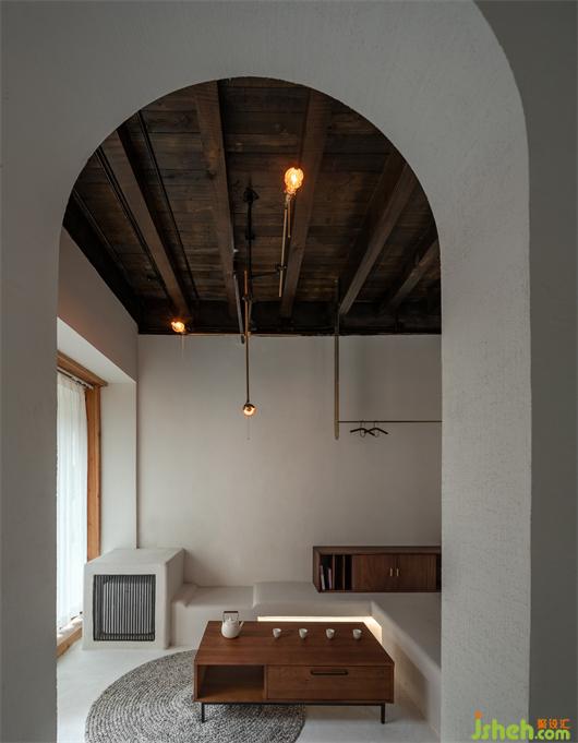 “溯”与“渡”复古怀旧,素净的白岩墙,深棕色的原木,基克拉迪风格的拱门,为空间赋予了独特的印记。