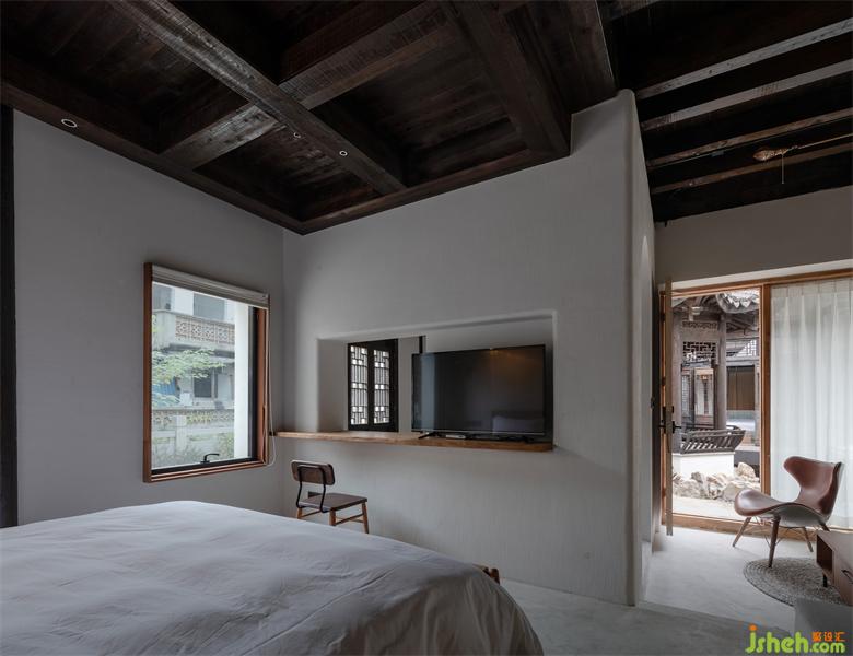 After the second entrance isthe guestroom area ofhotel. The original lotus pond is retained in thecourtyard, and thewalkway iswidened to leaveenough space around the pond forfrolicking and watching fish. Theguesthouse has 16 rooms of varied styles, whichencircle this charmingaquatic courtyard like 16lustrous pearls. The rooms are named「Su」,「Fan」,「Bo」,「Ze」,「Han」,「Hao」,「Run」,「Yang」,「Zhan」,「Hong」,「Du」,「Tian」,「Yi」,「Dan」,「Che」and「Cheng」, which are allcharacters with the“water” radical. Water isintelligent, and also thesource of life; to observe water is to look into heart.