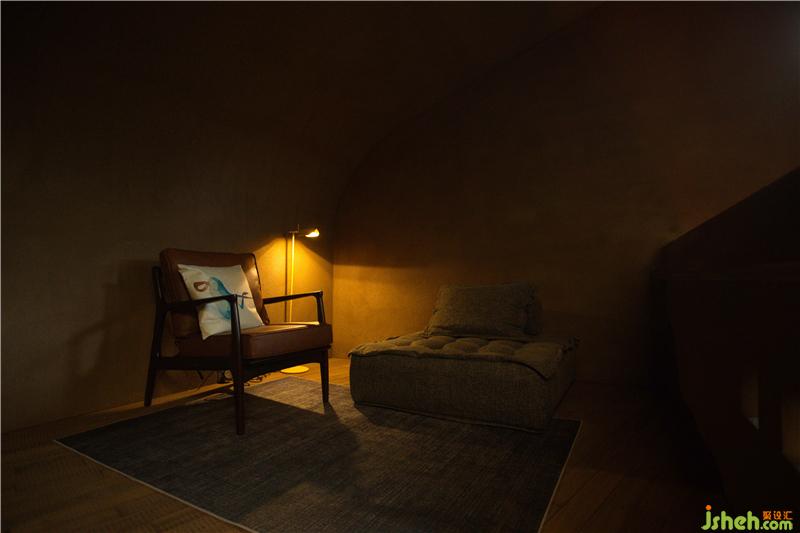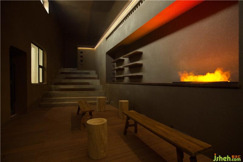 同时,我们在整个建筑空间中,设置了一处蒸汽壁炉,壁炉的火焰给人以温暖的感受,这是人的天性,我们愿意聚拢与火堆,盘腿而坐,细细攀谈。但这不是我们的唯一目的,榆林窟的天气是极为干燥的,这虽然为壁画艺术品的保存创造了得天独厚的条件,却对人的生活是极不友善,于是,我们希望通过蒸汽雾化功能,增加空间里的湿度,给人们一个更加舒适的环境。而对于空调的考虑,我们也是极为巧妙的把它隐藏在了空间的夹角里,这不仅节约了空间的使用率,保证了层高的最大化,也让这个空间显得更加的纯粹,这无疑是让空间更加友善的一种极好的方法。