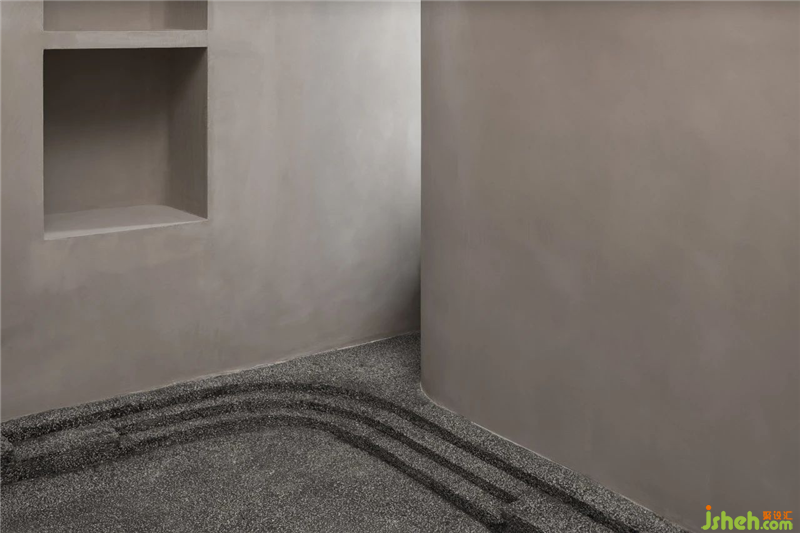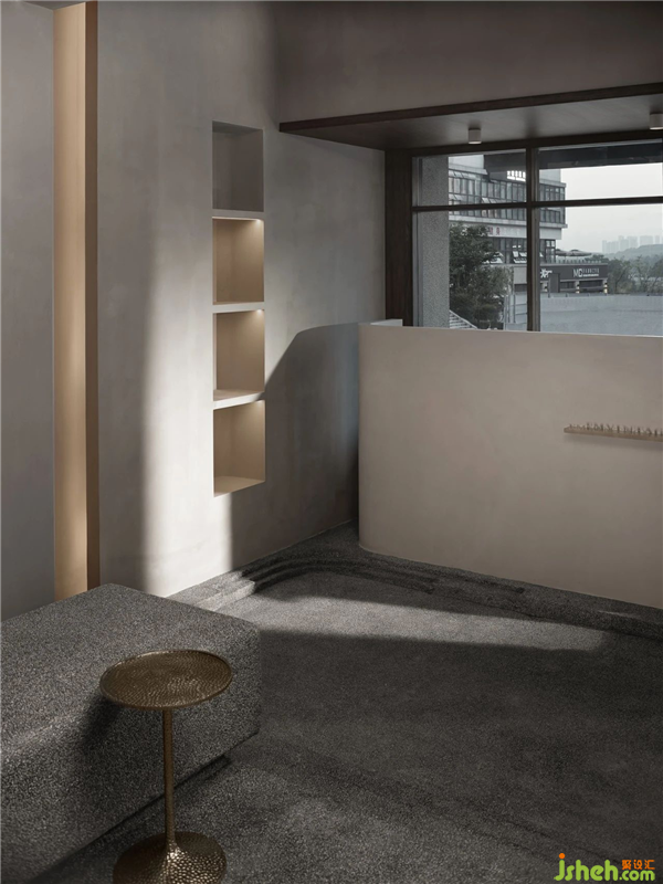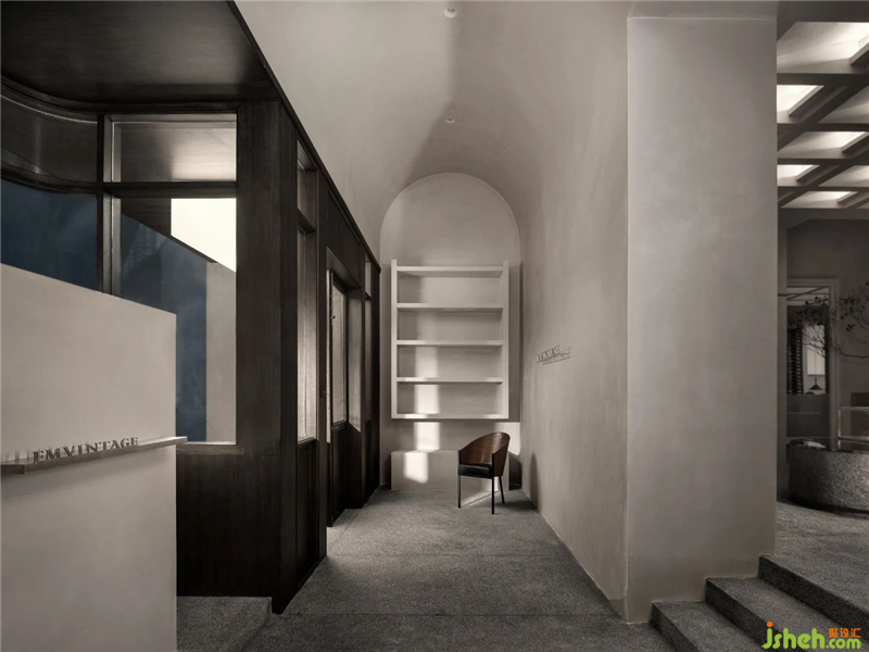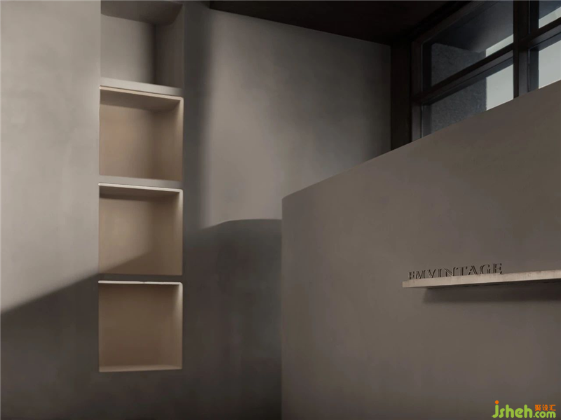 那么,展厅设计在保证空间趣味性的同时,品质感需要得到一定的保证。要吸引他们走进来,坐下去,形成空间文化的感召力。退后的门头便是这样的思考逻辑,友善的空间关系,让过往的行人有了走进来的欲望。而后的长廊,并未放置过多的产品。这是为了神秘感的营造。而这样的营造,只为让你充满好奇的再进一步。抬高的地台,让空间的层次与趣味得以保证,且在地台的位置设置了主要的产品陈列区。高高在上的奢侈品包包正是迎合了消费者们的心理。经过抬高的陈列区之后,下沉的空间被分成了三个组成部分。最里面的空间为办公及仓储的功能。靠右的区域则是吧台及维修检验区,满满的仪式感,则暗示着这些来自欧洲的名品昔日的辉煌。而吧台对面则是宽敞舒适的休闲品鉴区。