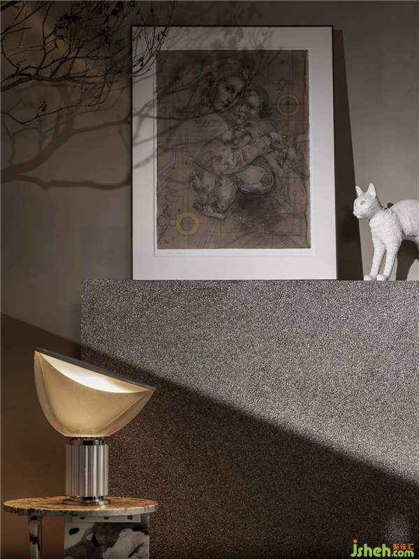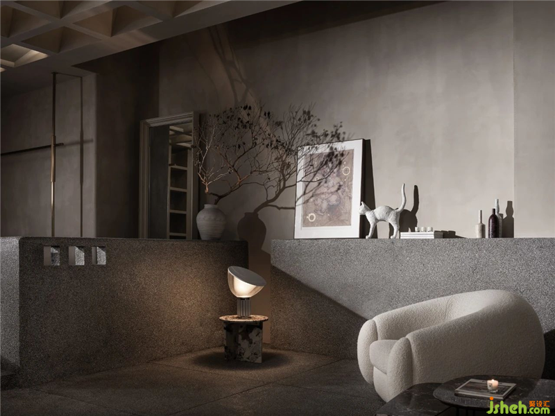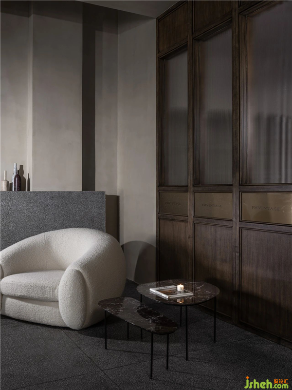 其次,展厅设计在软装的选择上我们摒弃了统一风格产品扎堆的处理方式。而是以一个买手的姿态去挑选适合的家具产品。从Franco的Tre pezzi扶手椅,到Jean Royere的大白熊,再到当代传奇设计师Philippe Starck的经典三足椅。无一不是向经典致敬。而flos的灯具与cc-tapis的地毯则是当下产品设计中的典范。我们将其整合在一起,在这个既冲突又奇妙的空间里,趣味横生。