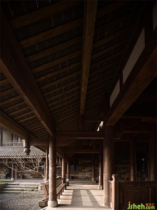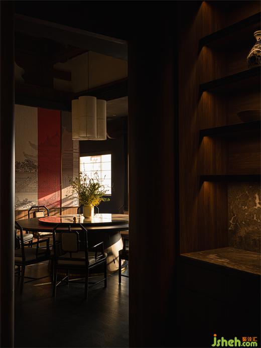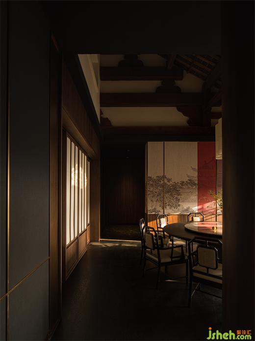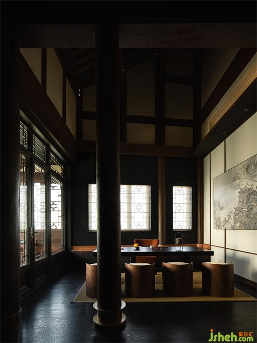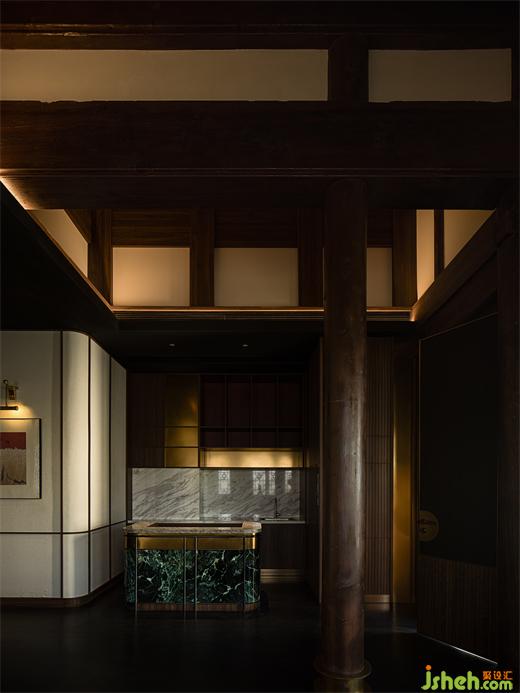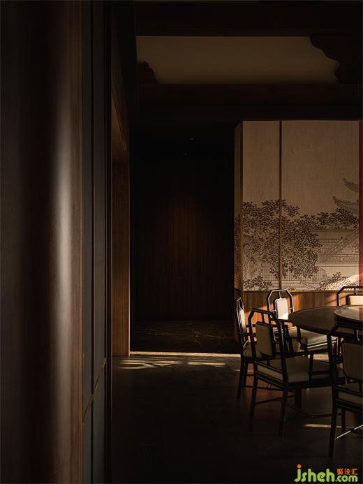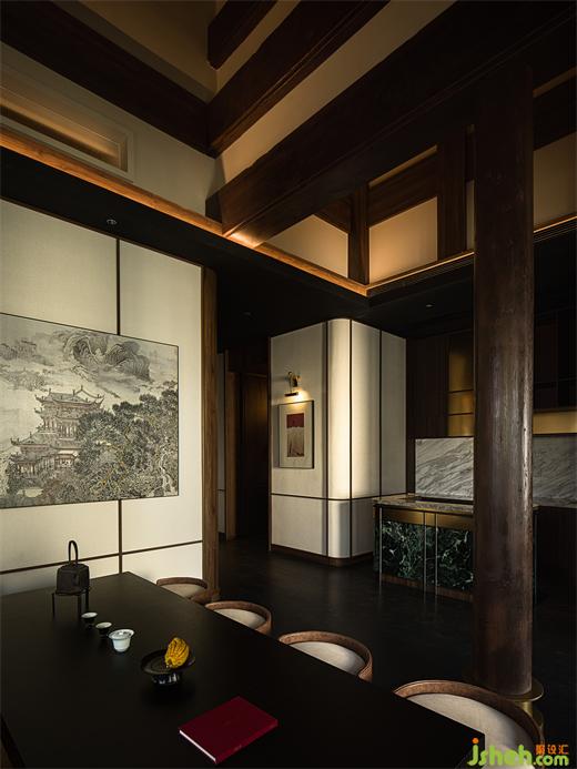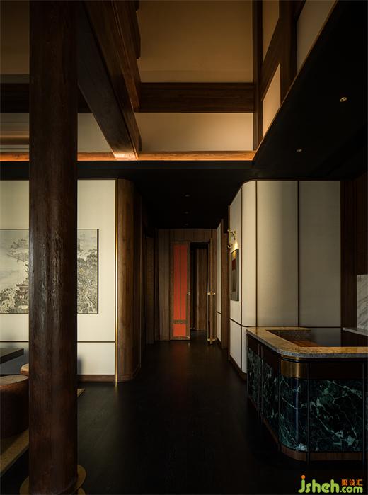 所以,在有限的建筑空间关系里,结合非对外经营的功能属性。我们舍弃了在传统酒店业态里所必须的前台接待及入住办理功能。而是将原本应作为接待功能的空间区域,演变成为了兼顾服务、咨询在内的公共开放活动空间。非遗会馆设计以此方式,解决了酒店入住配套应有的餐食、品茗、棋牌、KTV娱乐等附加功能。