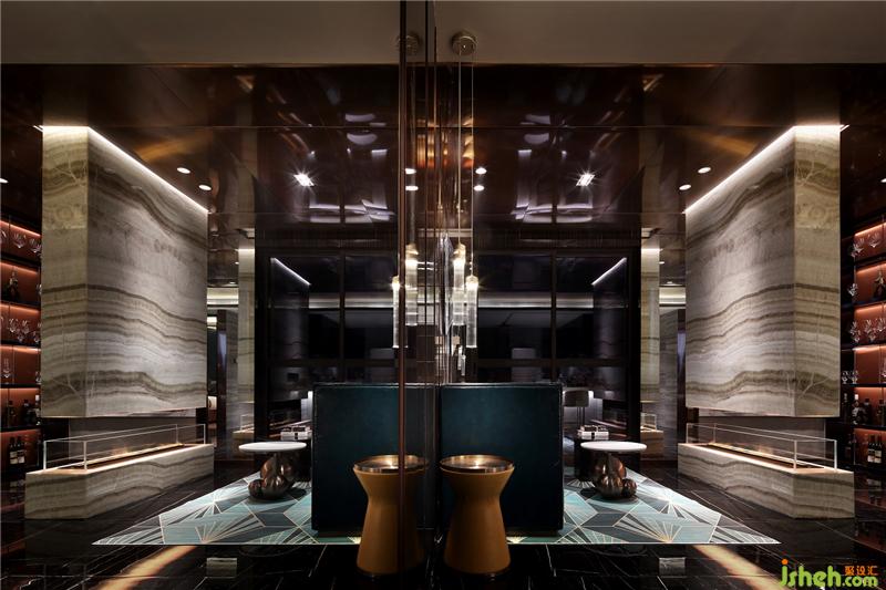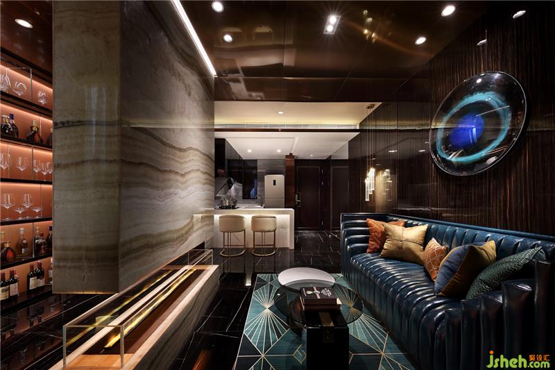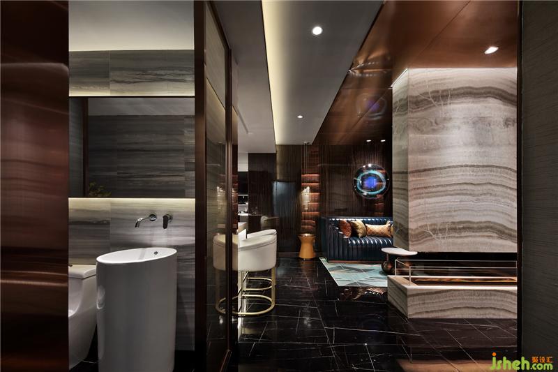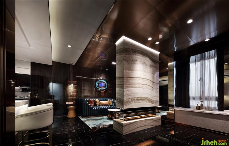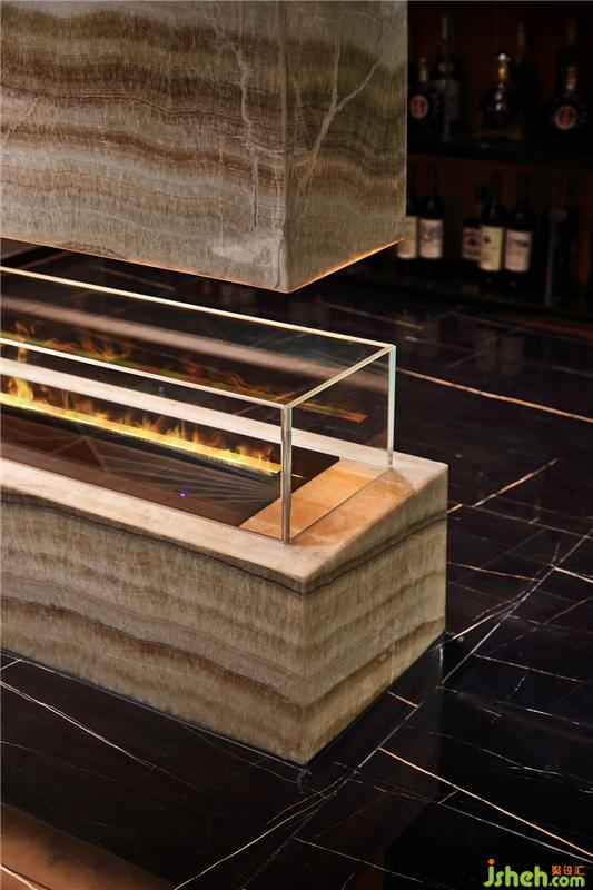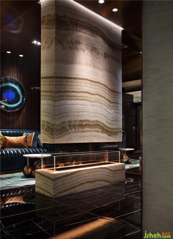 设计师以悬吊式壁炉界定空间,隔而不挡、悬而不落,一幅行云流水玉石墙巧夺天工,像一帘水幕从天而落,不禁感叹自然之美无与伦比。