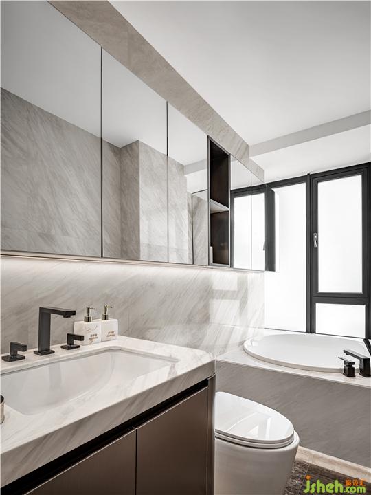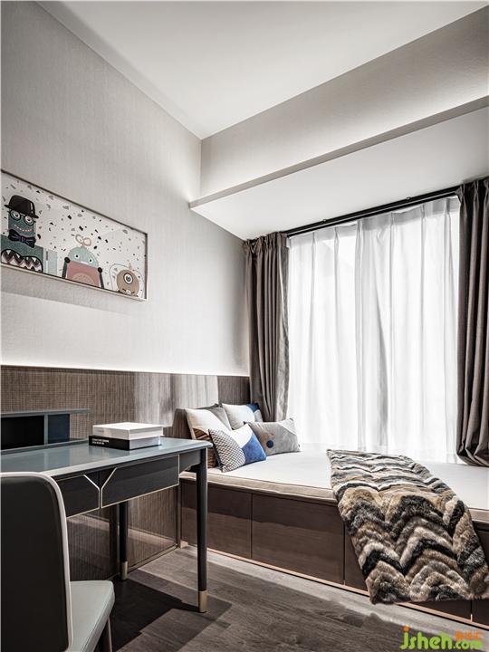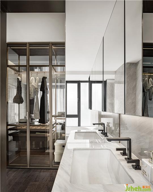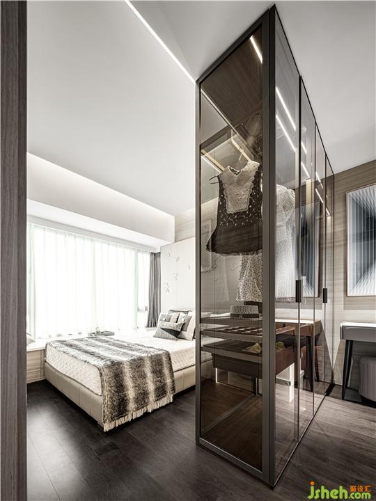 主卧空间以玻璃定制高柜划分空间,隔而不挡,通透空灵,在材料温度上很好的平衡的卧室空间松弛状态,而加入了理性、绅士的生活态度