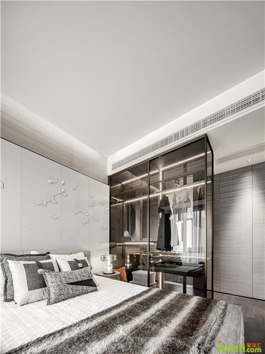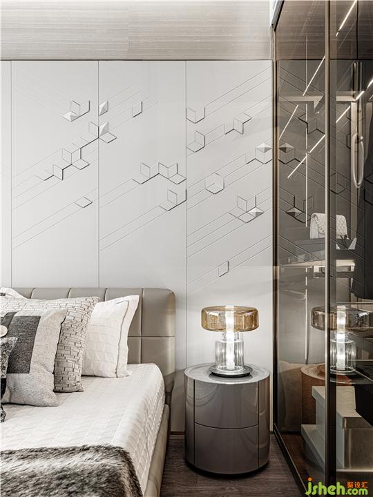 主卧背景以手工皮雕打造,与定制玻璃高柜完美结合,尽显都市时尚感。