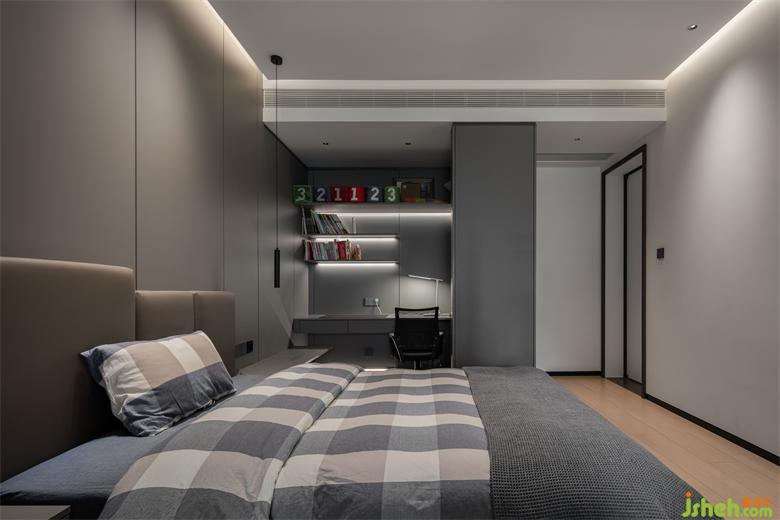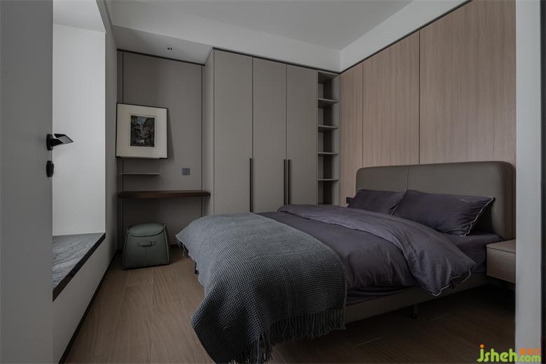 次卧用灰色与木色墙板相结合,丽雅龙城住宅设计打造丰富的视觉效果。渐进的层次、素雅的配色,都在为整个空间增添生活本源。