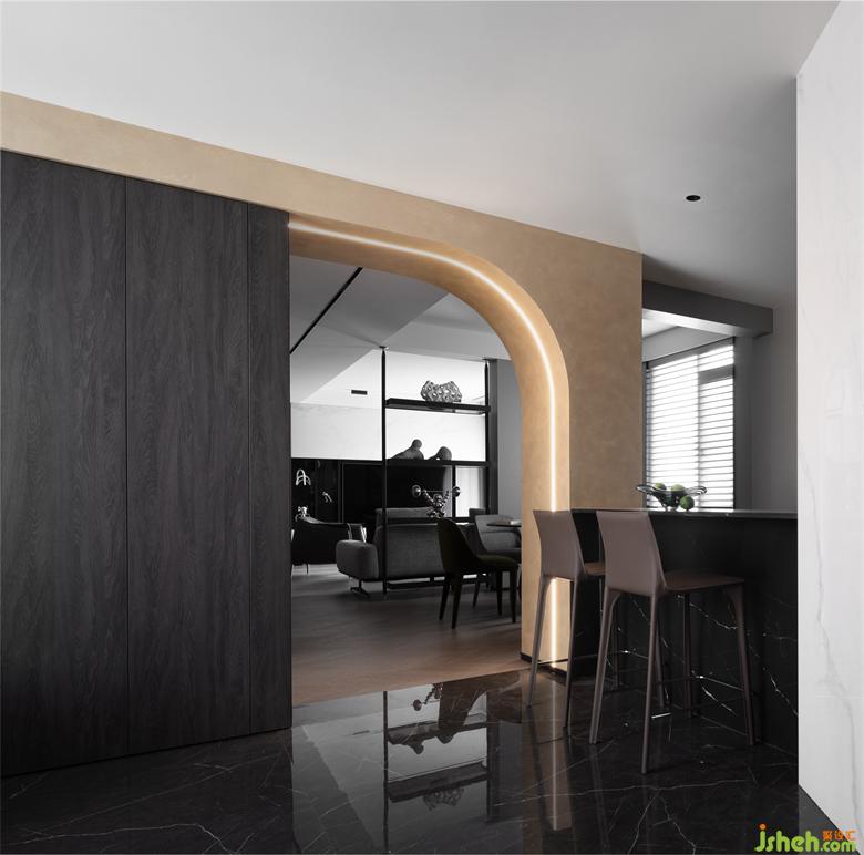 独特的异形结构总是能带给空间创造无数的惊喜,推开门的那一刻,映入眼帘的就是一幅与众不同的画面。宽敞的入户,鑫嘉园家居设计一面是造型独特具有隔断功能的玄关墙,一面是简单干净的矮柜收纳,不同材质的对比与功能搭配,营造出空间的高级感。