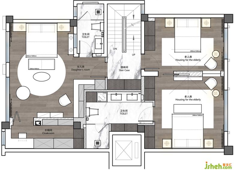 2、二楼布局老人套房与儿童房。儿童房把原本镂空位置做现浇搭建,完善空间,增加使用面积;老人房做分离式套房,看似整体,却相互独立;