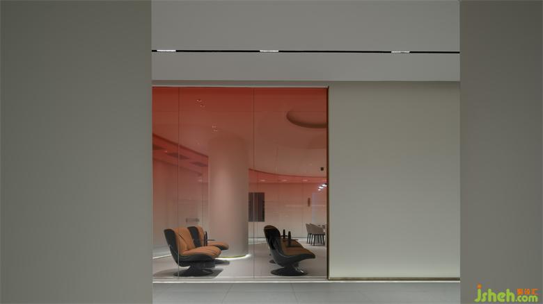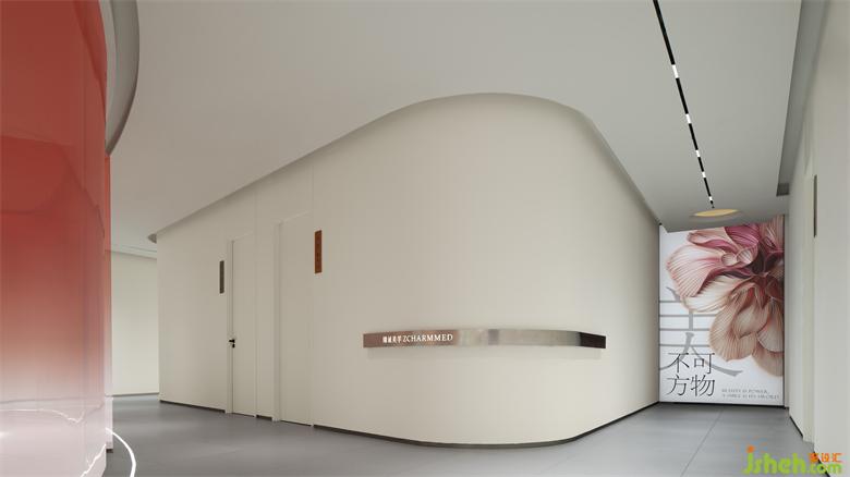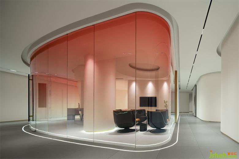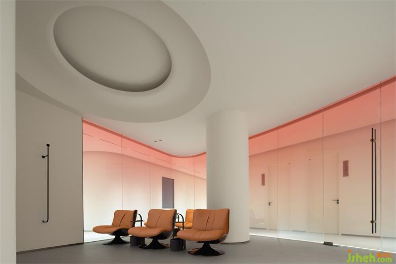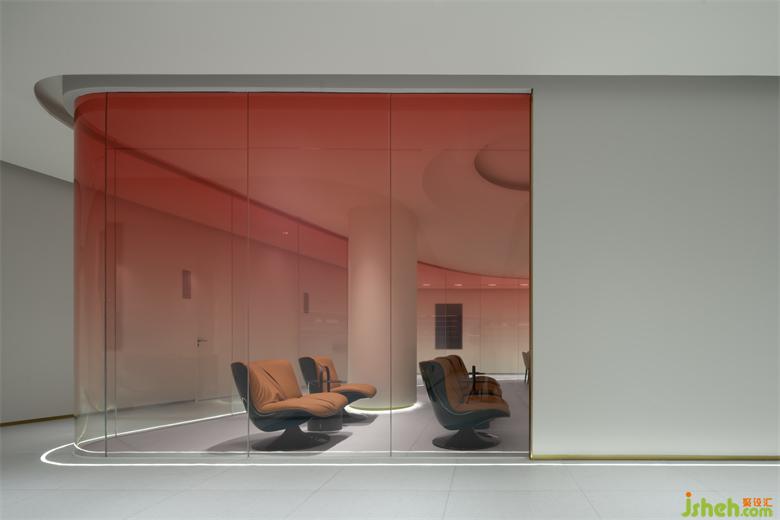 生活美容区像柔软的水被装进了一个异形玻璃容器,伫立在整个空间中心位置。旗舰店设计从上至下透感渐变的红色幕墙,像是光的指引,医美旗舰店装修设计折射出神奇的光影,以流畅、纯粹、柔和结合女性之美带来万变的形态。