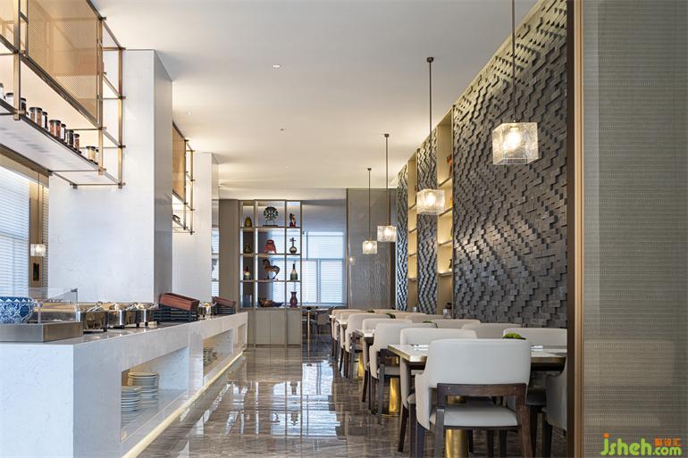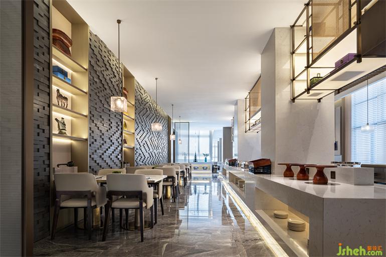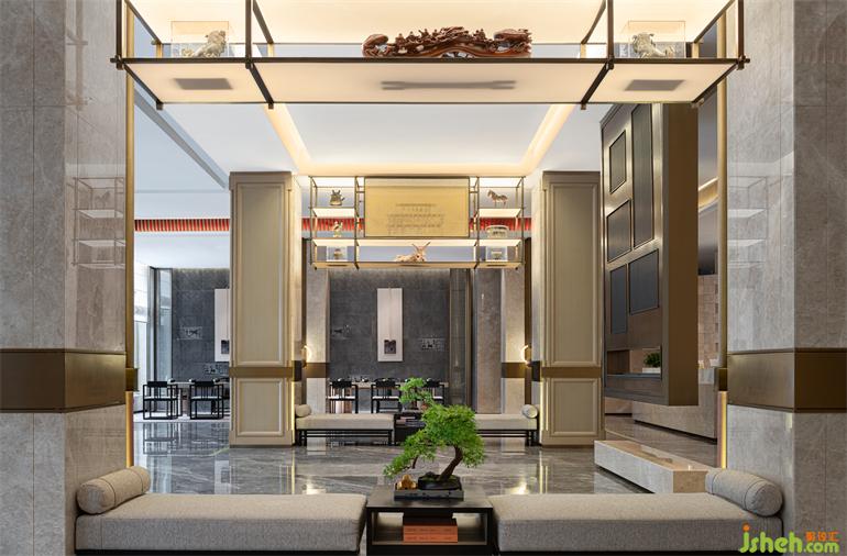 甫入前厅,便犹如踏进回溯历史的时光漫卷之中,夜郎古国的千载流光融入现代设计肌理,简约利落的设计笔触下满含深意。酒店设计师将夜郎风貌呈现于中央LED屏之上,将夜郎兽面纹糅合于隔断与石柱之间,将诗仙太白“随风直到夜郎西”的愁心具象于灯火之中,在理石塑成的极简建筑肌骨中赋活民族文化的精魂,让古典元素与现代审美共生共荣。
