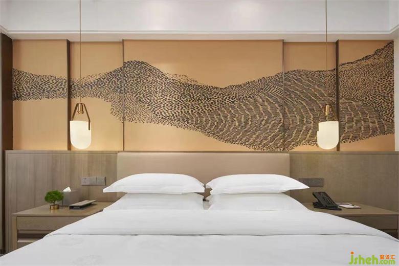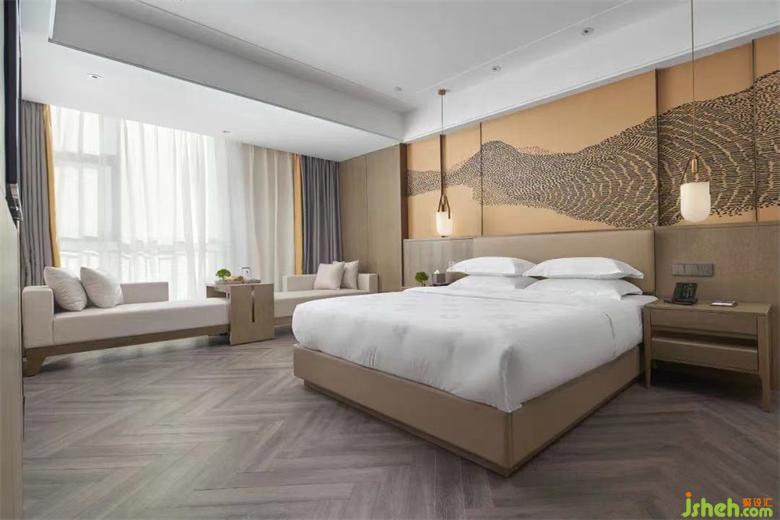 客房的硬装设计延续了极简与硬朗的风格,多以温润的原木材质铺陈,在当代与传统之间找到了灵感的最佳契合点。标准大床房取意于龙泉浅滩的流沙之景,贵州观山湖酒店设计将沙砾翻涌的画面具象为巨幅壁画,满铺在房间的床头背景,在霎那间给旅客带来心灵震撼的同时,也将浓厚的贵州印象嵌入旅者的记忆,使自然意趣与人文精神实现贯通统一。