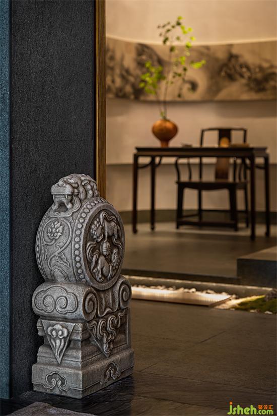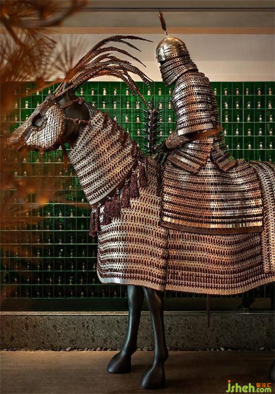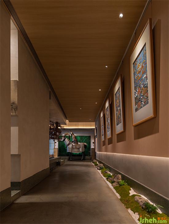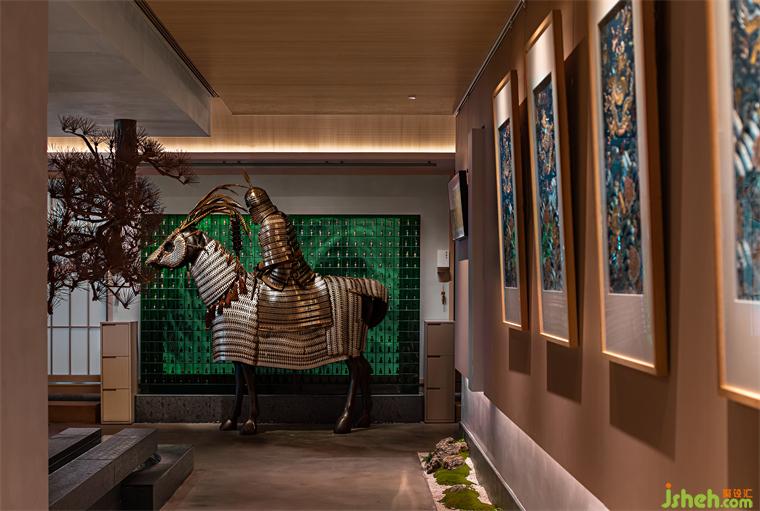 不止于空庭独酌的风雅,把杯欢歌的疏狂亦是设计师想要赋予空间的属性。深圳晴舒料理设计师在餐厅中加入“铁浮屠、时光宝铠”等元素,兵器、甲胄等意象的融入,中和了和式风格千篇一律的内敛与缄默,塑造出骑兵凯旋、同饮共庆的场景感,将干云豪气糅合于空间气质之中。