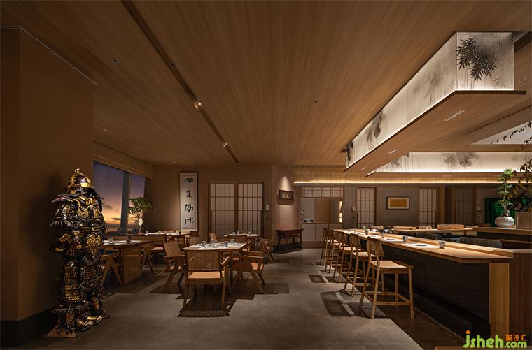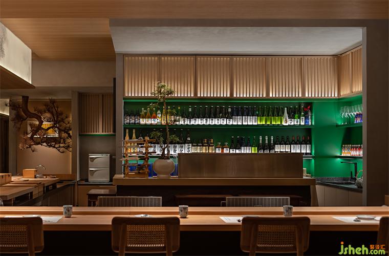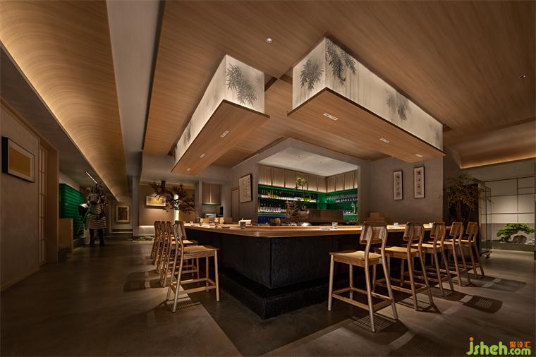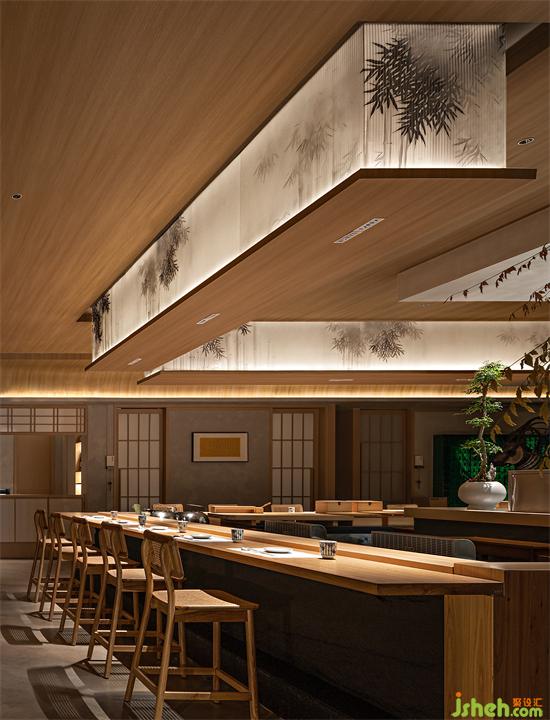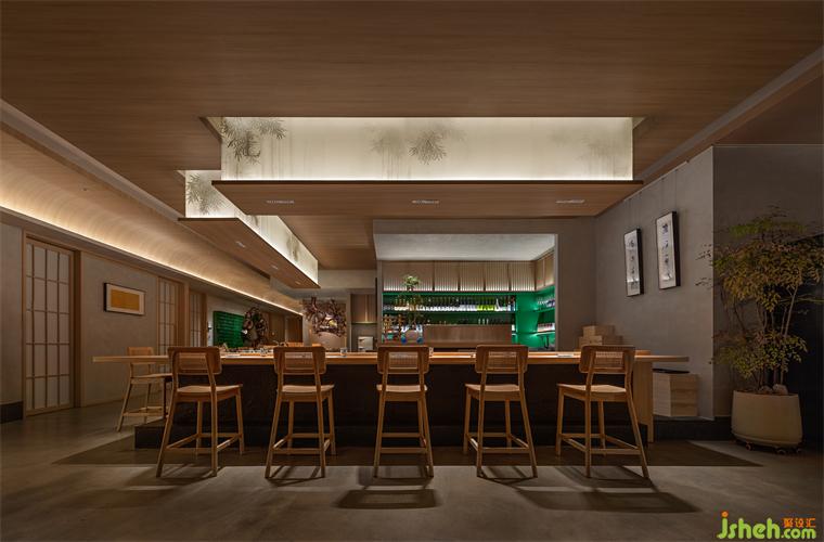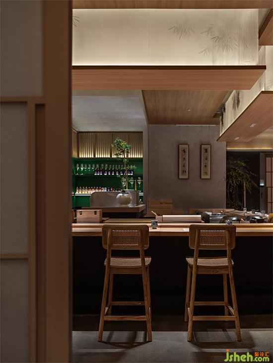 公共区域分为板前料理区与景观卡位。料理区采用传统半开放就餐形式,深圳晴舒料理设计师摒弃复杂繁饰,仅保留桧木、和纸及微水泥等自然材质作洗练表达。单一简洁的装饰布局不仅体现了侘寂幽玄的至简之美,更避免了空间装饰喧宾夺主的可能,让食客更能专注于食材品质与用餐过程,品味料理本身的独特魅力。