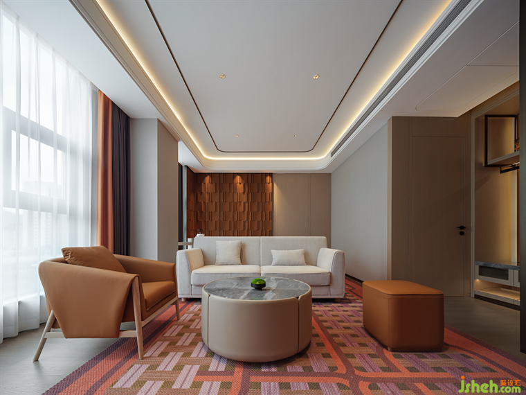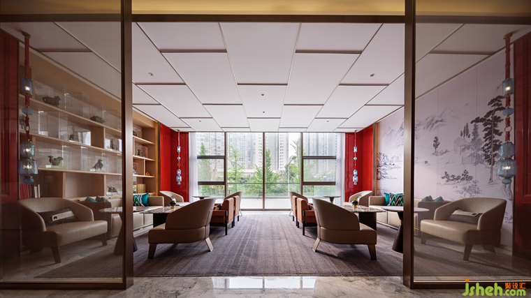 The principles of Eastern classical aesthetics emphasize "clarity and translucency in window mullions, and intricacy and delicacy in railings". This entails using the lines of doors, windows, and railings as borders to produce a refined effect of framing scenes like works of art. The designer incorporates landscaping expertise into the lounge design, skillfully merging the boundaries of different functional zones within the space. Utilizing key points and spatial landmarks, they achieve a dynamic interplay between the functional areas, creating a shared scenic ambiance. Ink-splashed landscapes resembling mountains and rivers, distant forests, glistening wave patterns, and gentle brushwork interlace to form an enchanting dream. The interplay between illusion and reality generates interest, converting the space into a leisurely poetic realm painted with the strokes of ink.