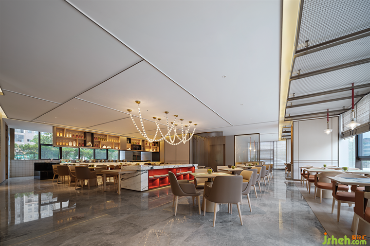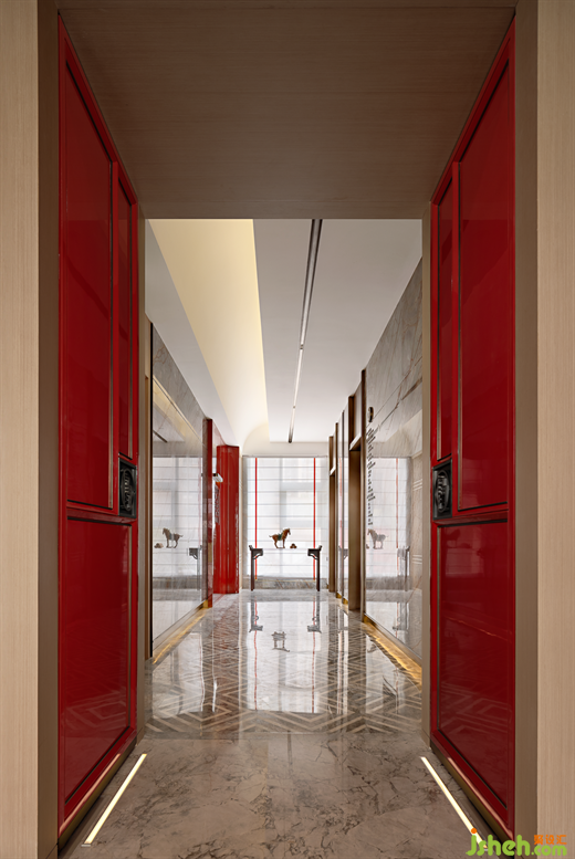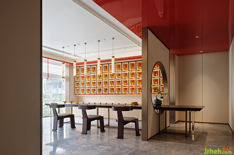 Crafting spatial depth and tactile sensations transcends mere accessory layering; thisproject blends classical architectural elements with contemporary design methodologies, showcasing a pronounced cultural identity within the space. The design of the communal dining space not only embraces the festive and classical charm of the lobby's vibrant red hue, but also integrates contrasting painted surfaces, layered glass, and brushed antique bronze metal in terms of materials. The harmonious blend of modern elements and traditional embellishments heightens the perception of subtle luxury, blending scholarly elegance with a pursuit of quality in one setting.