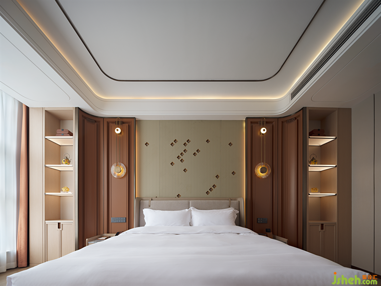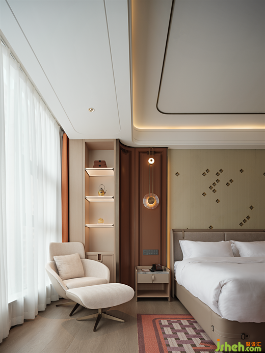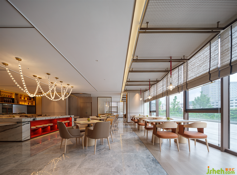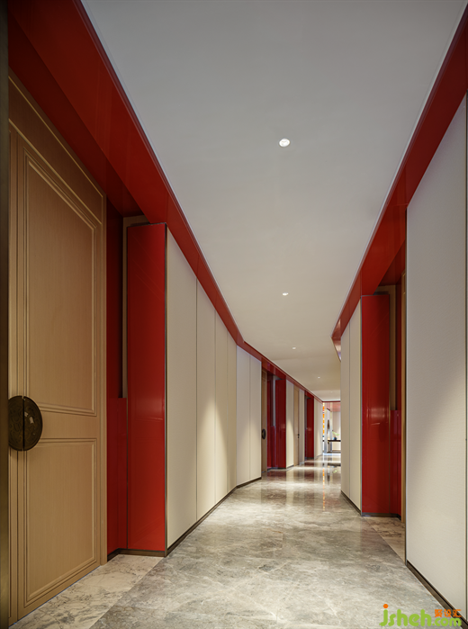 空间层次和质感的创设并不局限于配件的叠加,本案酒店设计融合古建筑配件与现代设计手法,在空间内体现出鲜明的文化辨识度。公共餐区的设计中既沿袭了大堂朱红色的禧庆与古雅,亦在材质上加入跳色烤漆面、夹丝玻璃及拉丝古铜金属。现代元素与传统配件的融合让轻奢品位愈显矜贵,纳文人襟怀与品质追求于一域。