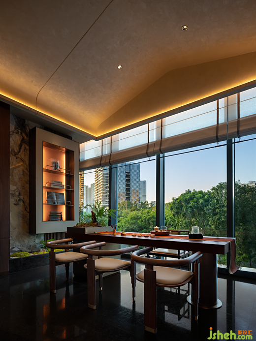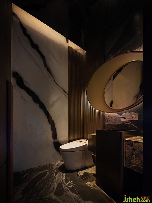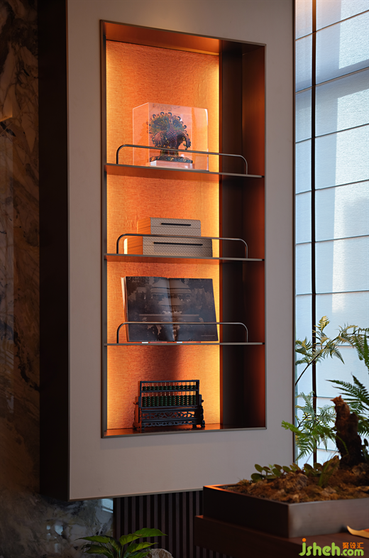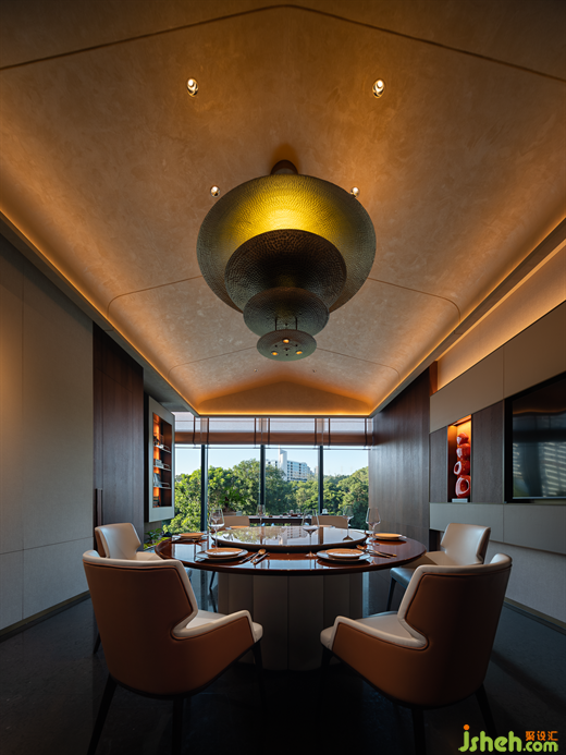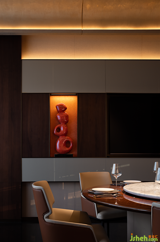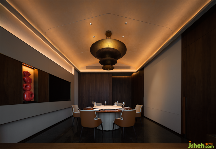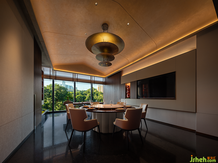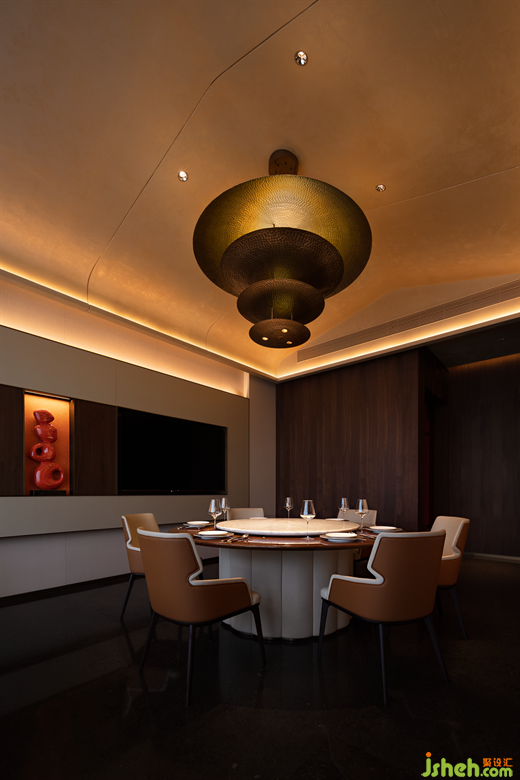 邀圆月相照,对花影共饮,空间正中选用弧形金属艺术照明装饰,分明的光影质感如月亮自身阴晴圆缺的演变,让人在觥筹交错间,感受月照的灵动变化,天花配以洒金色穹顶,仿若月华流转,挥洒漫天云光。Invite the full moon to shine, drink with the shadow of flowers, space in the middle of the choice of curved metal art lighting decoration, clear texture of light and shadow such as the moon's own evolution of yin and yang, so that people in the intermingling of drinks, to feel the moonlight of the dynamic changes in the ceiling with sprinkles of gold dome, as if the moonlight flow, sprinkle the sky cloud light.