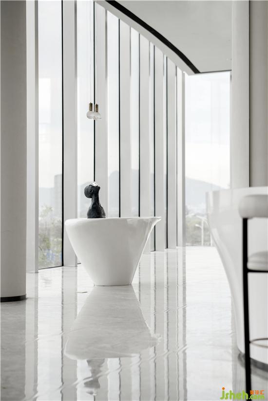 设计师以建筑自有的弧面形态和通透玻璃界面,将引景入室作为设计的切入点,以不动声色之美学,收纳人杰地灵的自然之馈赠。售楼处设计